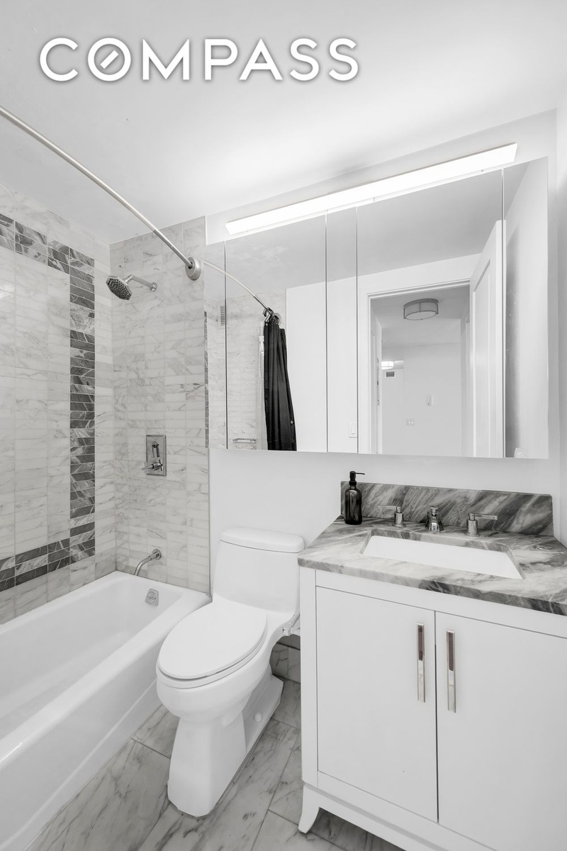 A marble bathroom with elegant hardware completes this crisp and refined residence. Additional highlights include five-inch wide white oak plank flooring throughout and two separate PTAC units for multi-zone heating and air conditioning.
