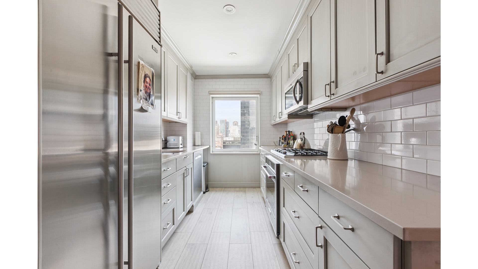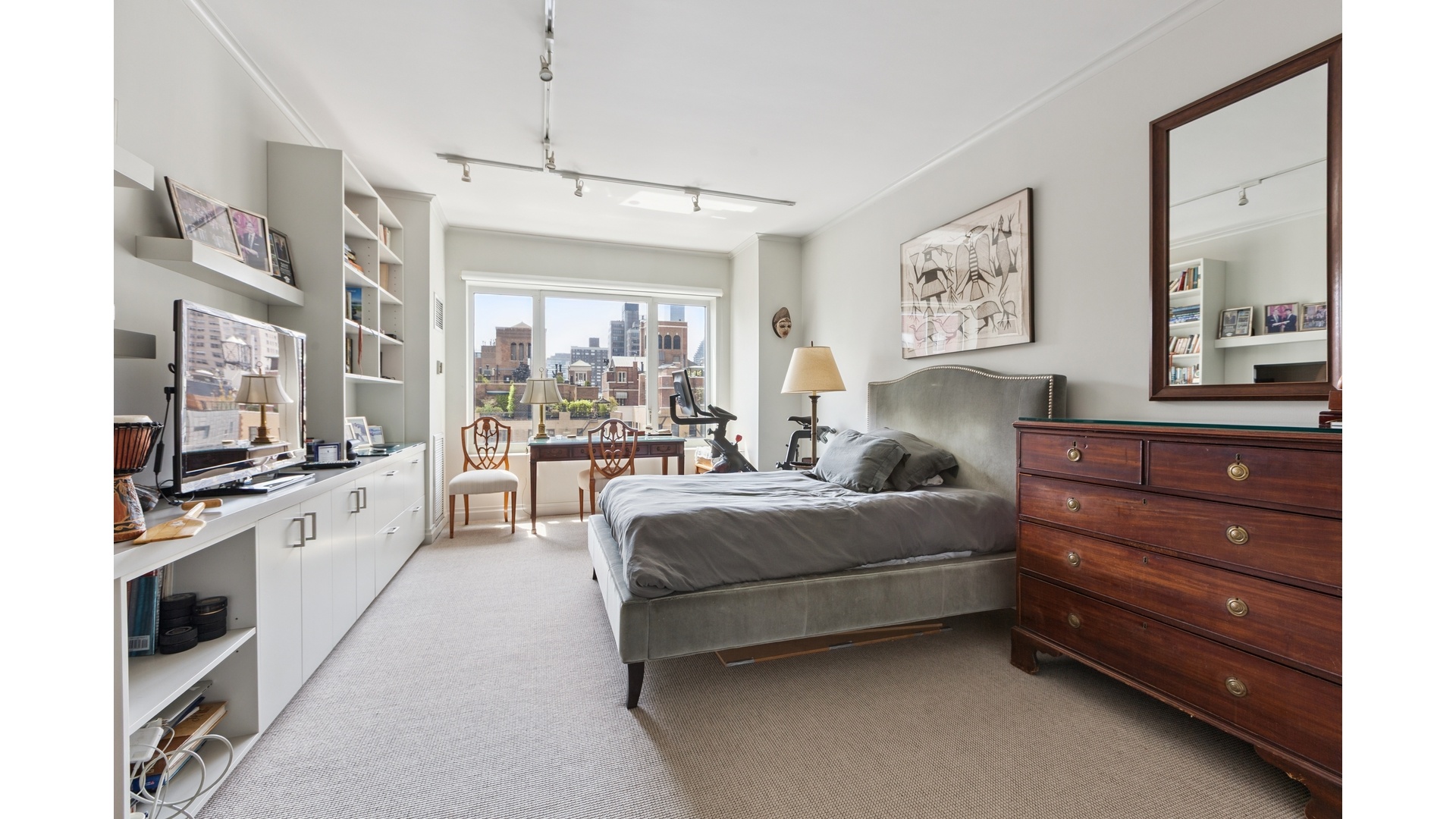 The enormous balcony, with exposures to the south, east, and west, provides wonderful sunlight and open views throughout the day. The grand primary suite is a true retreat, featuring a sun-filled bedroom, massive his-and-hers walk-in closets, and a luxurious windowed bath with dual sinks, a separate shower, and soaking tub.