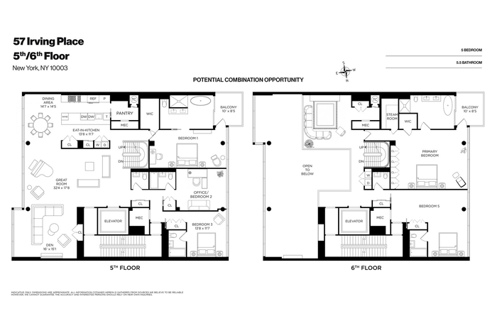 Unprecedented opportunity to combine two sublime full-floor residences overlooking historic Gramercy with over 100 linear feet of floor to ceiling glass, this is your chance to achieve nearly every comfort on your wish list and create one of the city's finest modern residences at 57 Irving Place, New York, NY 10003, where 5-star boutique Condominium living meets privacy in prime Gramercy.