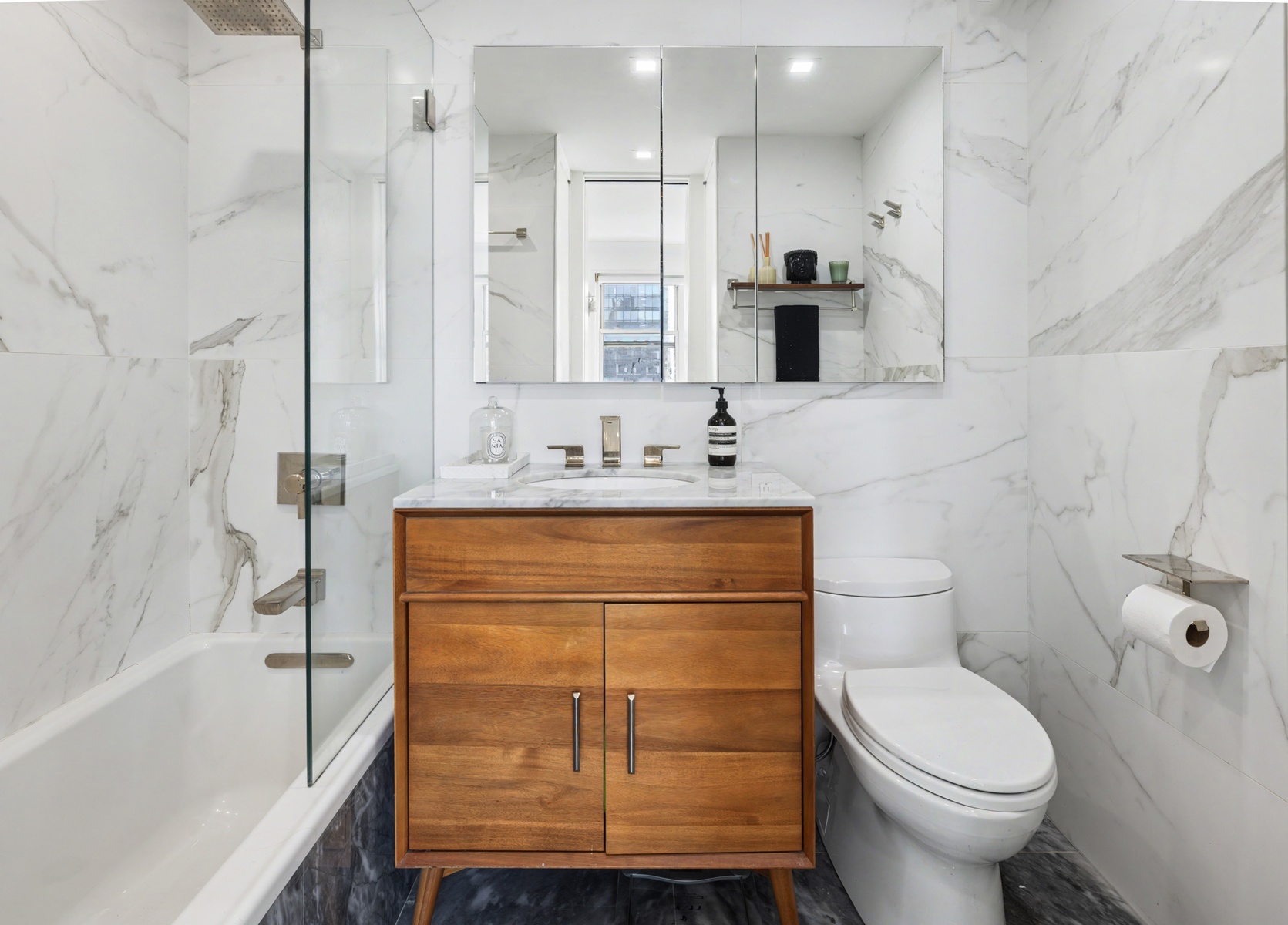 The bathroom features a soaking tub/shower combo, a teak vanity with Carrara marble top, polished nickel fixtures, Plata Reserve marble floors, and Astrella Bianco matte porcelain walls; plus a pocket door entry where there are also additional closets.