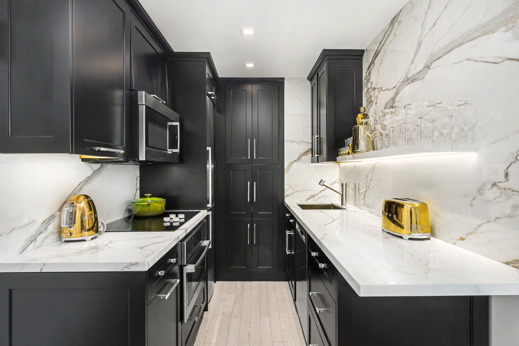 A "wow" feature is the chef's open kitchen appointed with satin lacquer cabinetry, Calacatta Paonazzo slab countertops and back splash, and stainless-steel appliances by Bosch.