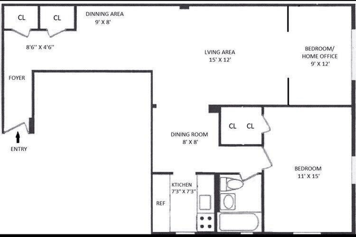 The layout is both functional and inviting, highlighted by an 8’ x 8’ granite breakfast nook, a spacious 15’ x 12’ living area that flows into a 9’ x 8’ dining space, a primary bedroom approximately 11’ x 15’, and an additional 12’ x 9’ room perfect for a second bedroom or home office.