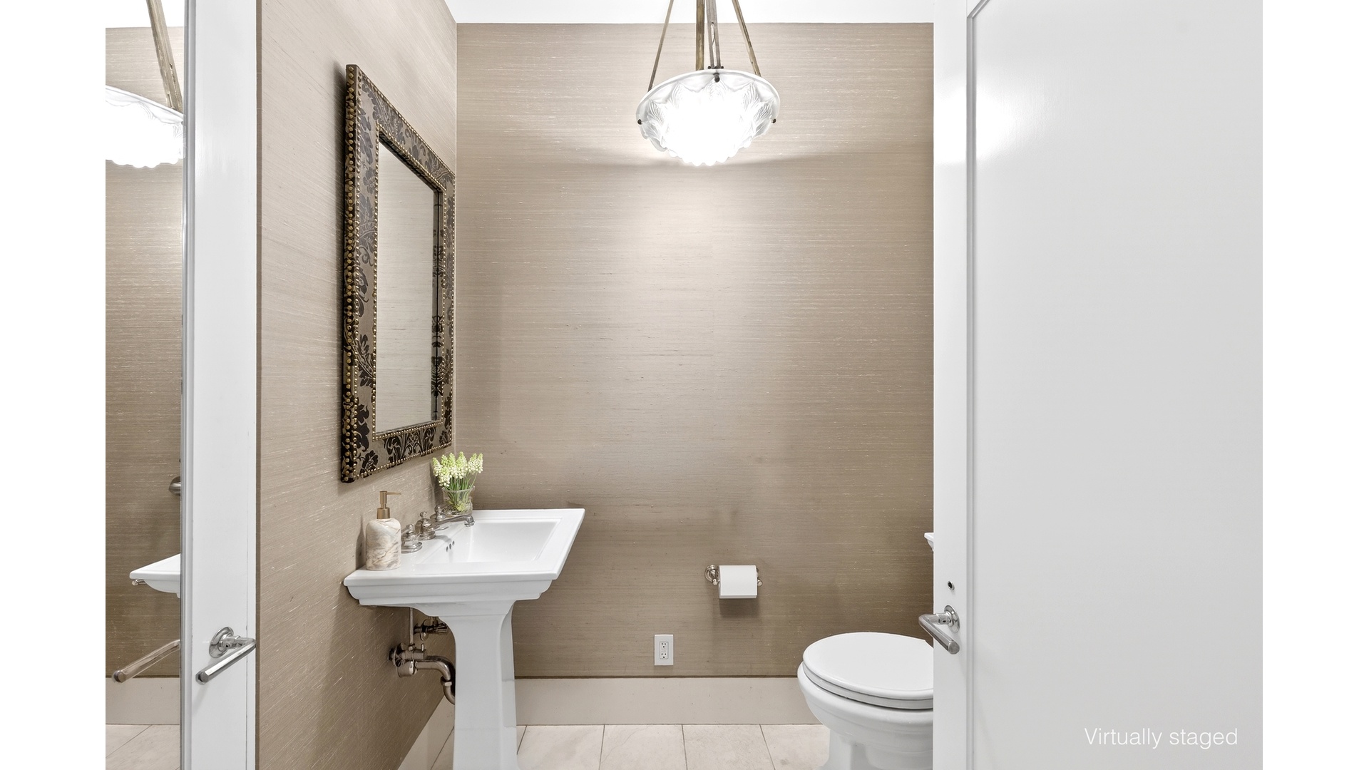 A sophisticated material palette underscores the home's quiet luxury. The Art Deco entry vestibule is clad in full slabs of polished Absolute Black granite, Corinthian Beige, and Crema Bianco. The kitchen is finished in soft Rosa Aurora marble, and the primary bath is appointed with striking slabs of exotic green-brown Madreperola-each selection curated for both beauty and permanence.