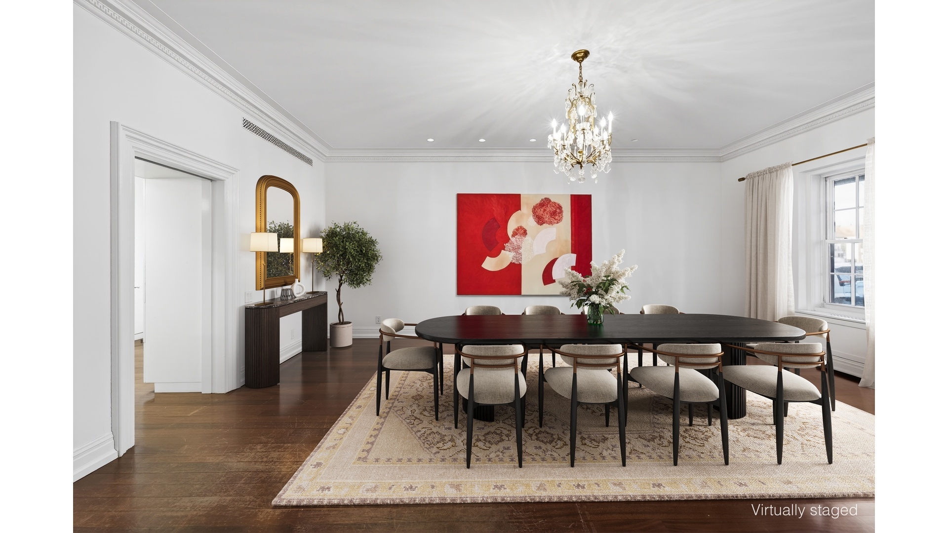 A grand entry foyer serves as a central gallery, elegantly dividing the entertaining rooms and establishing a seamless, gracious flow. The scale is immediately apparent: oversized room proportions and soaring ceilings are complemented by exceptional light from multiple exposures on all sides-an uncommon offering that floods the interiors with natural light throughout the day and enhances the sense of openness and volume.
