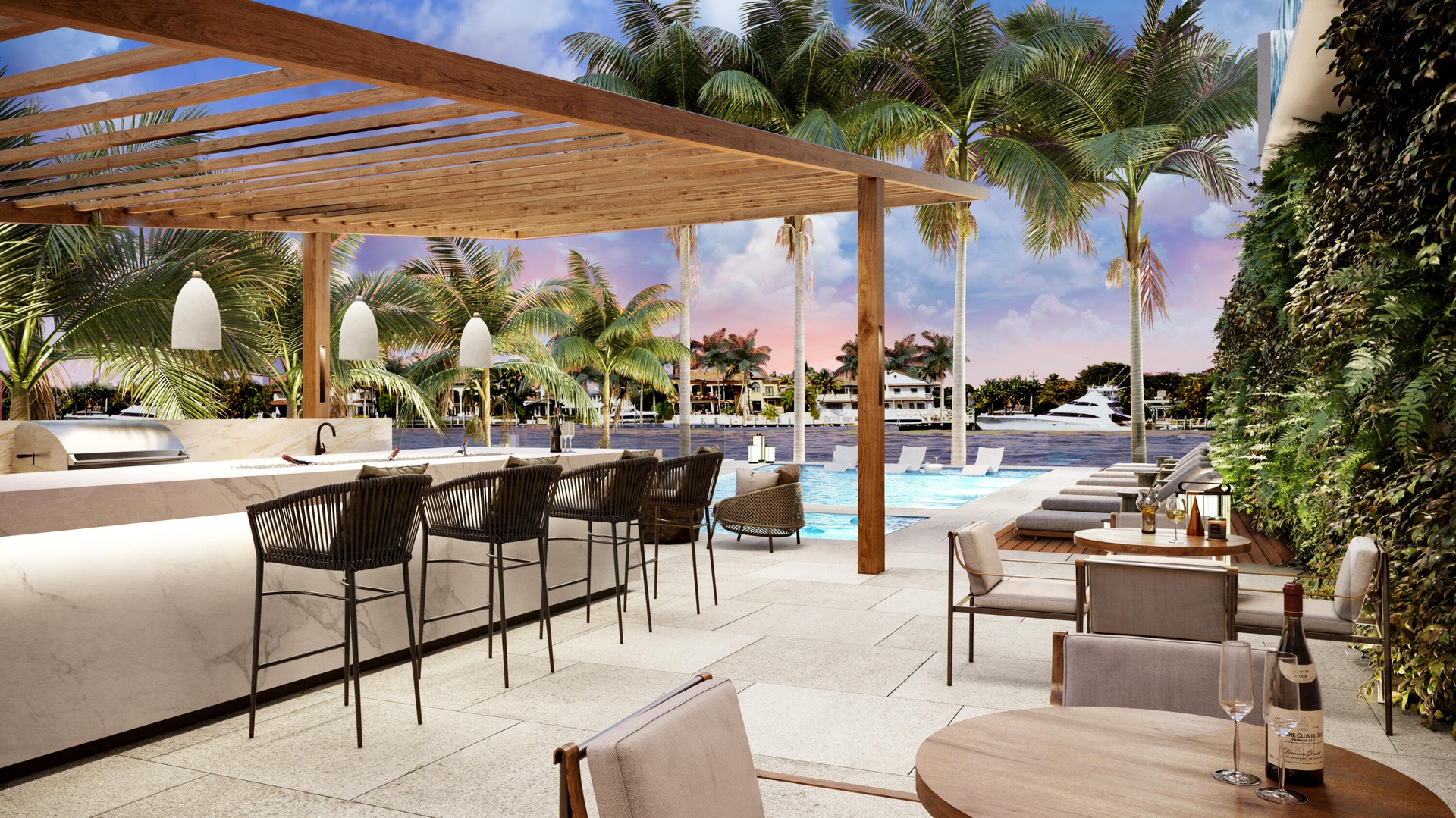 Corner new construction waterfront residence with expansive terrace and panoramic Intracoastal views.