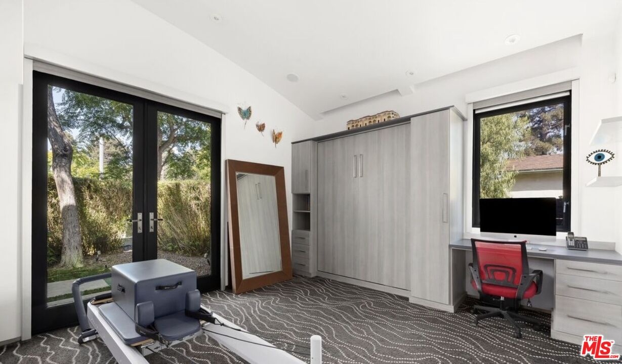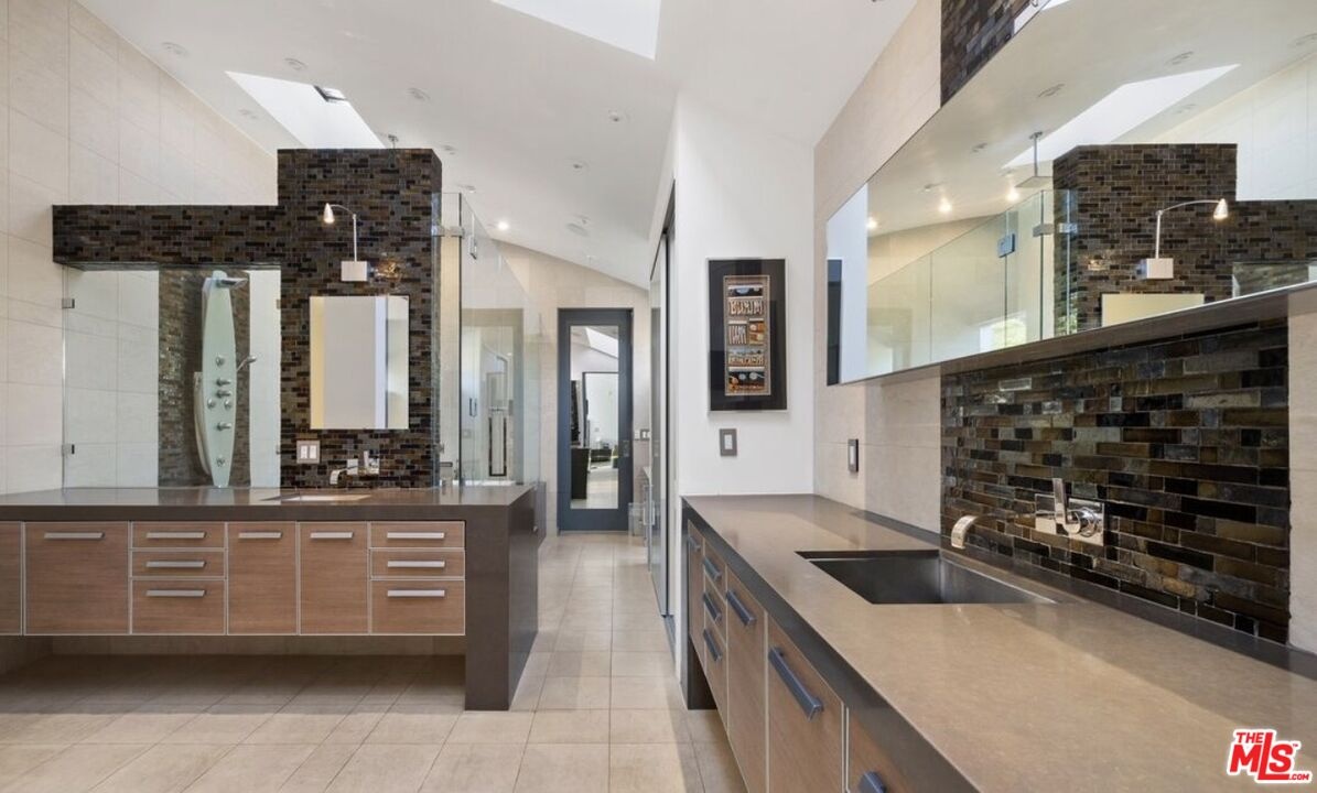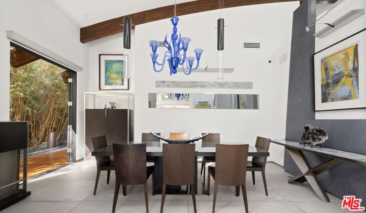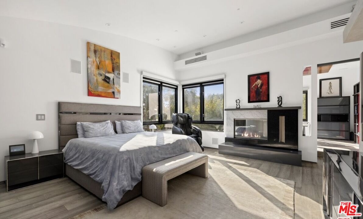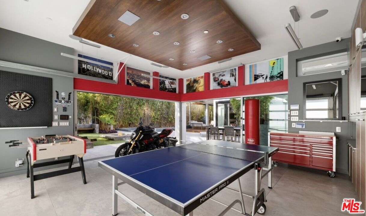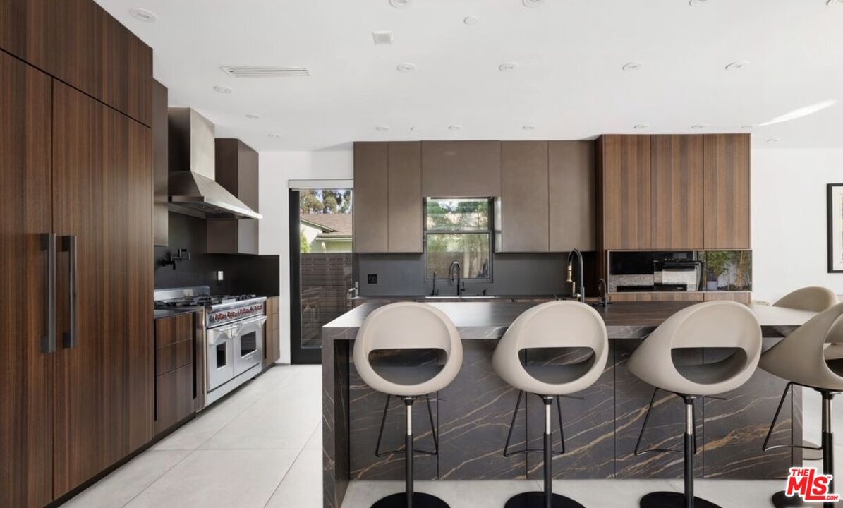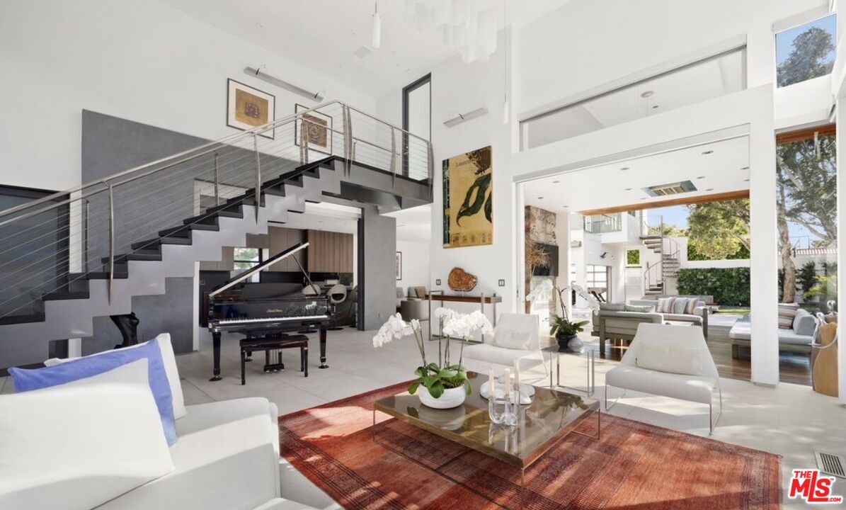 Located in the prestigious North of Montana neighborhood, this contemporary estate is privately set behind lush landscaping and mature trees, offering seamless indoor-outdoor California living. Floor-to-ceiling windows fill the formal living room with natural light, highlighting soaring double-height ceilings, exposed wood beams, a dramatic staircase, and a stylish wet bar. Pocket doors open effortlessly to the outdoor living area with fireplace, fire pit, and a striking black-bottom pool and spa.The formal dining room overlooks serene bamboo-lined grounds, while the Italian chef's kitchen features a Wolf range, Miele warming drawer, waterfall island, and premium appliances. The adjoining family room offers direct outdoor access and a massive 115-inch screen for ultimate entertainment.The primary suite boasts a spa-inspired bathroom with steam shower, jetted tub, dual vanities, and a private office. A two-story converted garage provides flexible space for vehicles, recreation, gym, yoga, or creative studio.Outdoor amenities include a built-in BBQ, expansive patio areas, and a fire pit lounge ideal for entertaining. Located moments from Brentwood Country Club, Brentwood Country Mart, top dining, parks, shopping, and world-class beaches.