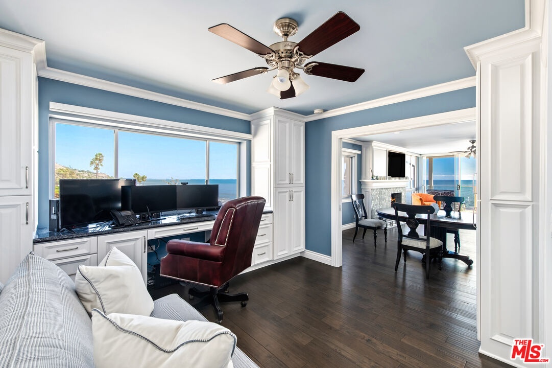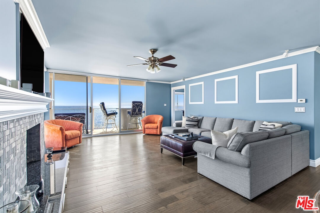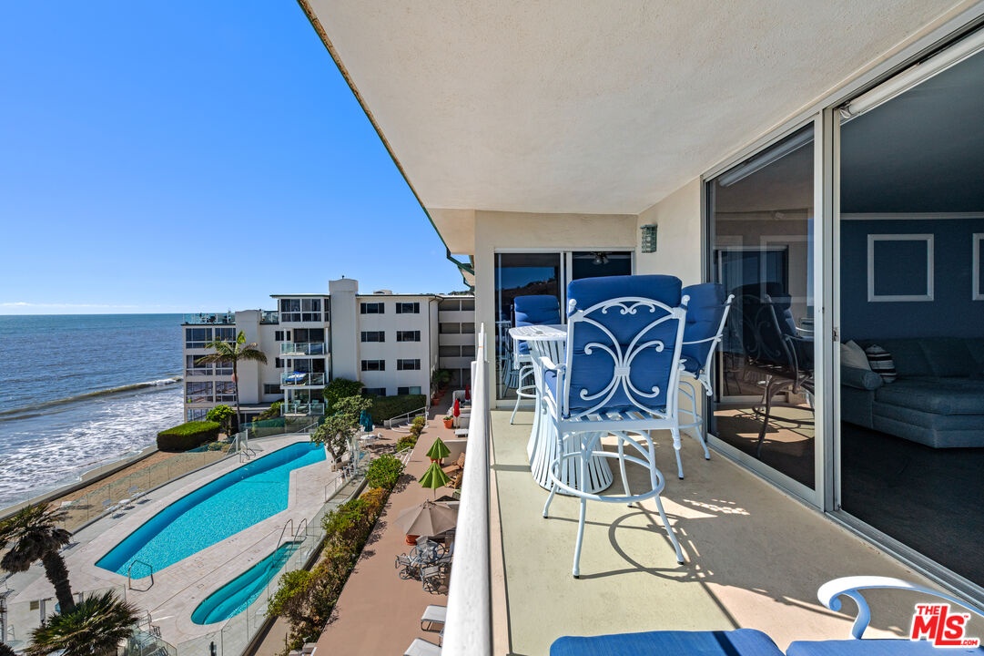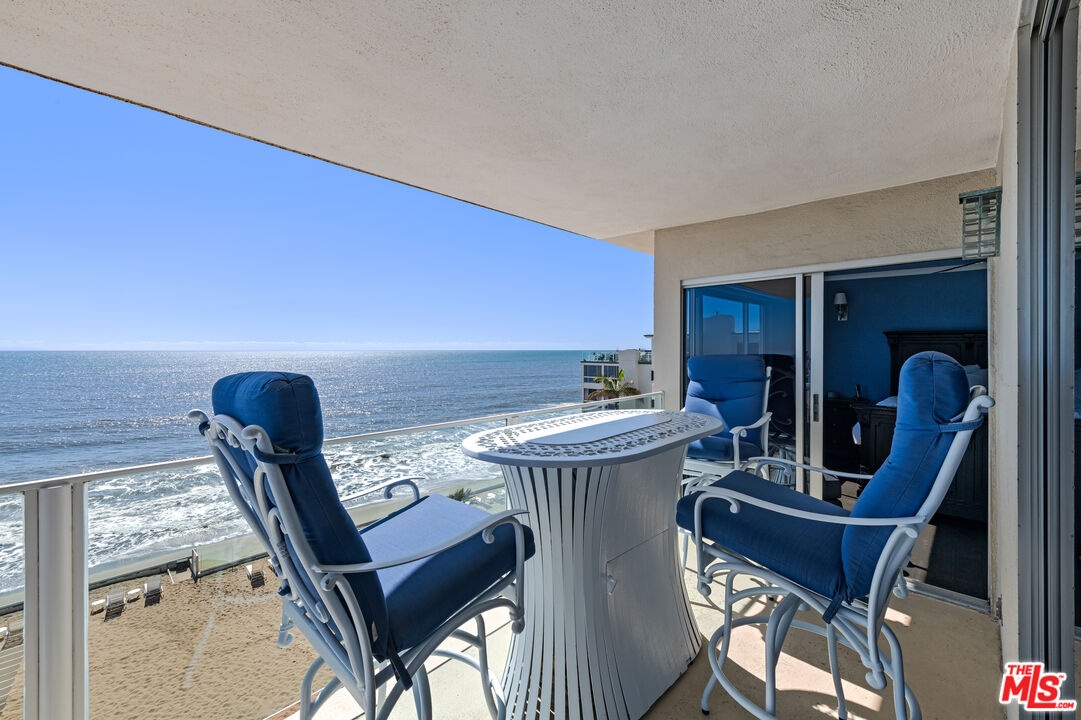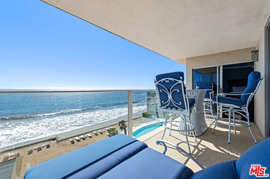 Set directly above the sand on Malibu's famed Carbon Beach, this top-floor corner residence at the exclusive Malibu Outrigger offers front-row panoramic ocean views stretching from Santa Monica to Catalina Island, with sightlines also capturing LAX and Palos Verdes. A rare opportunity in one of Malibu's few complexes with direct beach access and resort-style amenities, this sunlit condo blends timeless coastal charm with modern design. The open-concept living area features expansive walls of glass that frame endless blue horizons, a cozy fireplace, and seamless indoor-outdoor flow to a private oceanfront balcony perfect for morning coffee, outdoor dining, or watching dolphins play at sunset. The kitchen is beautifully designed with custom white cabinetry, granite countertops, and a stunning glass-tile backsplash.The ocean-view primary suite opens to the balcony and features a spa-like bath with dual vanities and a striking steam shower with Bose music system, clad in stone mosaic tile. A versatile second room doubles as a guest space or home office with built-ins, generous storage, and incredible coastline vistas. At the Malibu Outrigger, residents enjoy a heated oceanfront pool and spa, direct sandy beach access, an on-site management team, and an unparalleled location close in proximity to Soho House, Nobu, Malibu Pier, and the Country Mart. One covered parking space plus surface lot parking for additional cars and secure entry complete this rare beachfront offering.