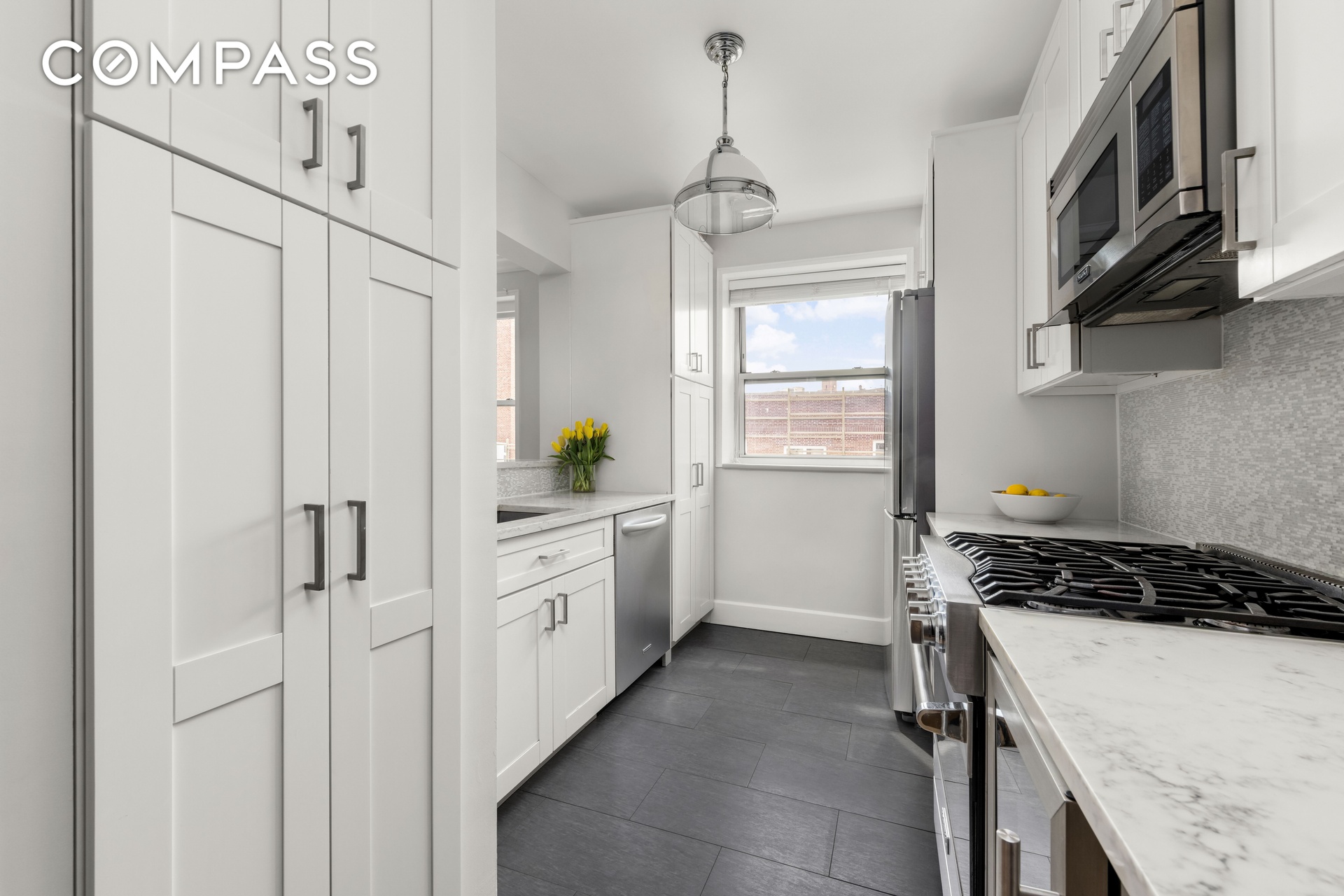 Enter into the large foyer complete with two large outfitted coat closets and room for house size furniture. The south facing living room and dining alcove are sunbathed and are a great place to live in and to entertain in, featuring a dining room table with seating for six. The open, windowed, chef's kitchen features top-of-the-line finishes and appliances such as a 5-Burner Viking Range and Viking microwave, a KitchenAid dishwasher, a Samsung four door refrigerator complete with ice-maker and filtered water dispenser and, a wine cooler. Beautiful quartz counters and ceramic backsplash as well as custom wood cabinets throughout. The pantry is very spacious an feature several pull out drawers. Porcelain floors complete this modern kitchen.