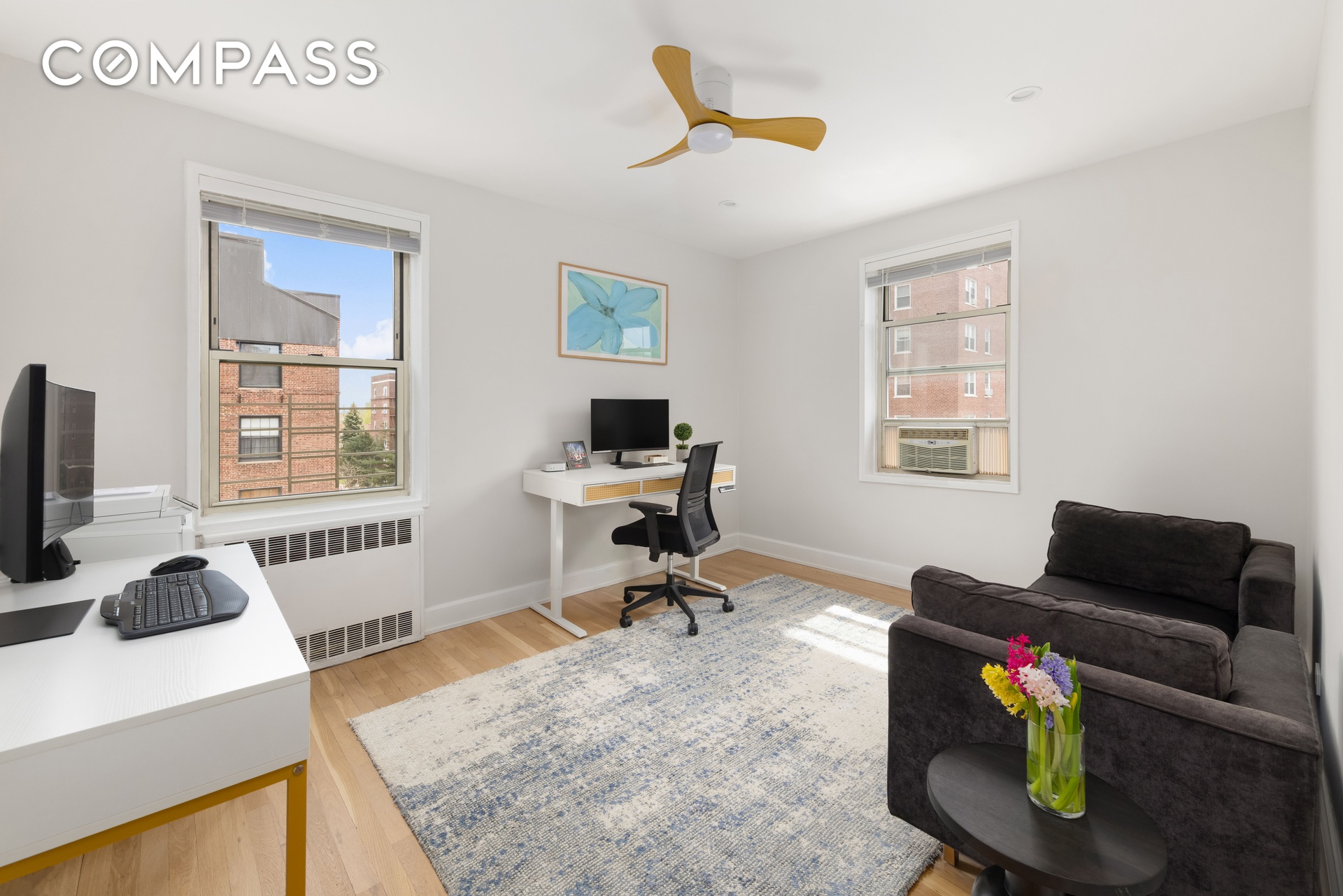 There are 7 total closets throughout the apartment al of which are outfitted by The Container Store/Elfa storage. New electric solar shades in the living room as well as custom window treatments throughout by The Shade Store inclusive of blackout roman shades in the primary bedroom. Beautiful oak floors throughout with a matte finish as well as modern ceiling fans with lights in ever bedroom.