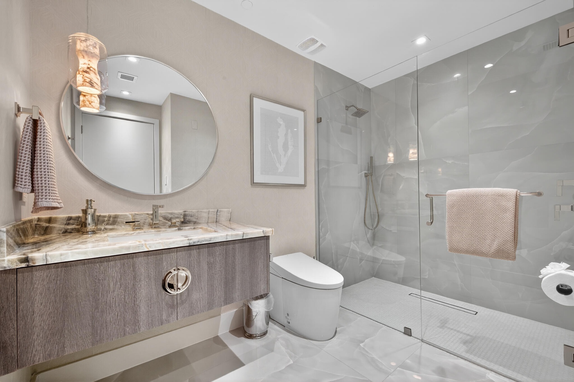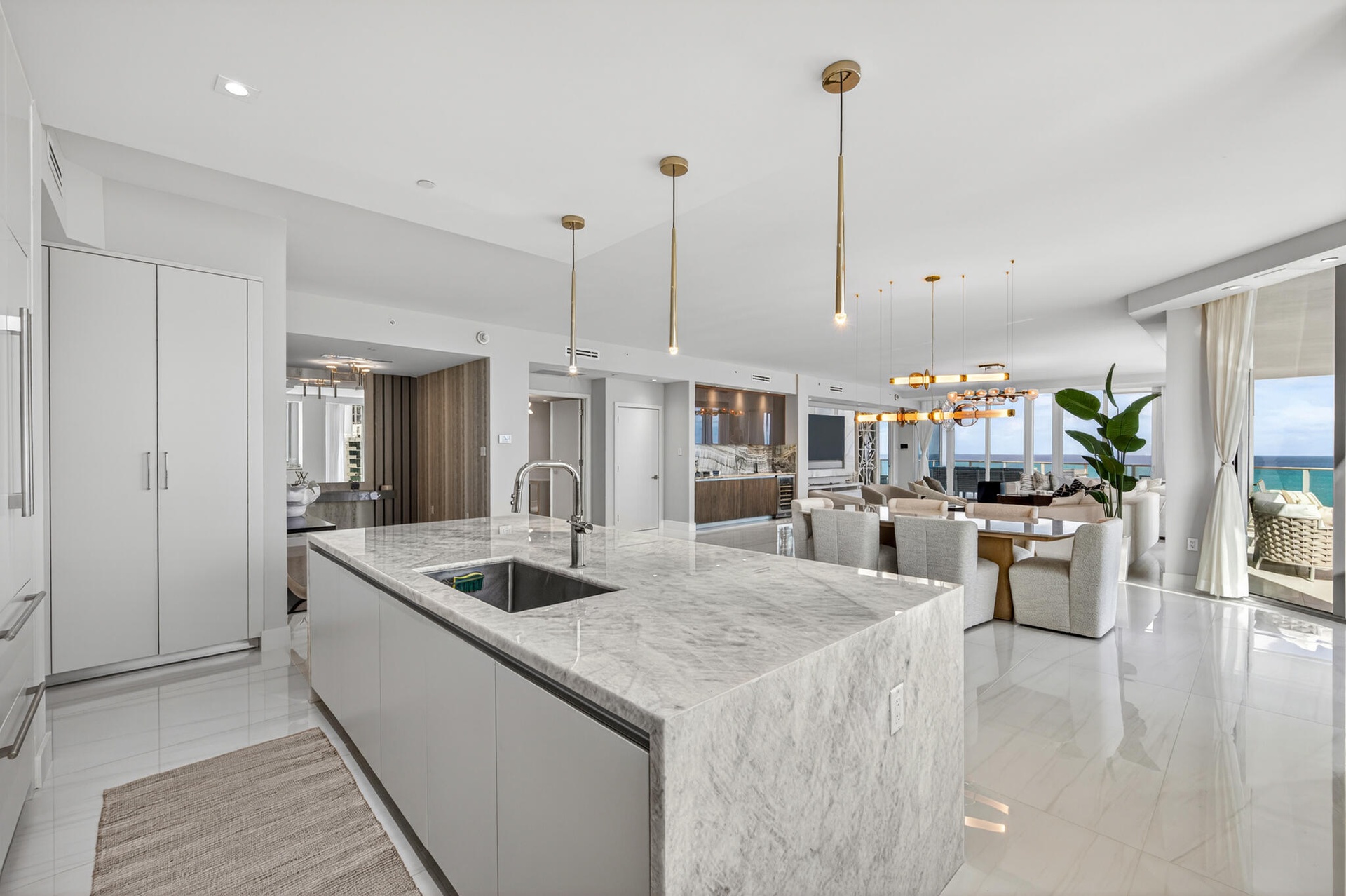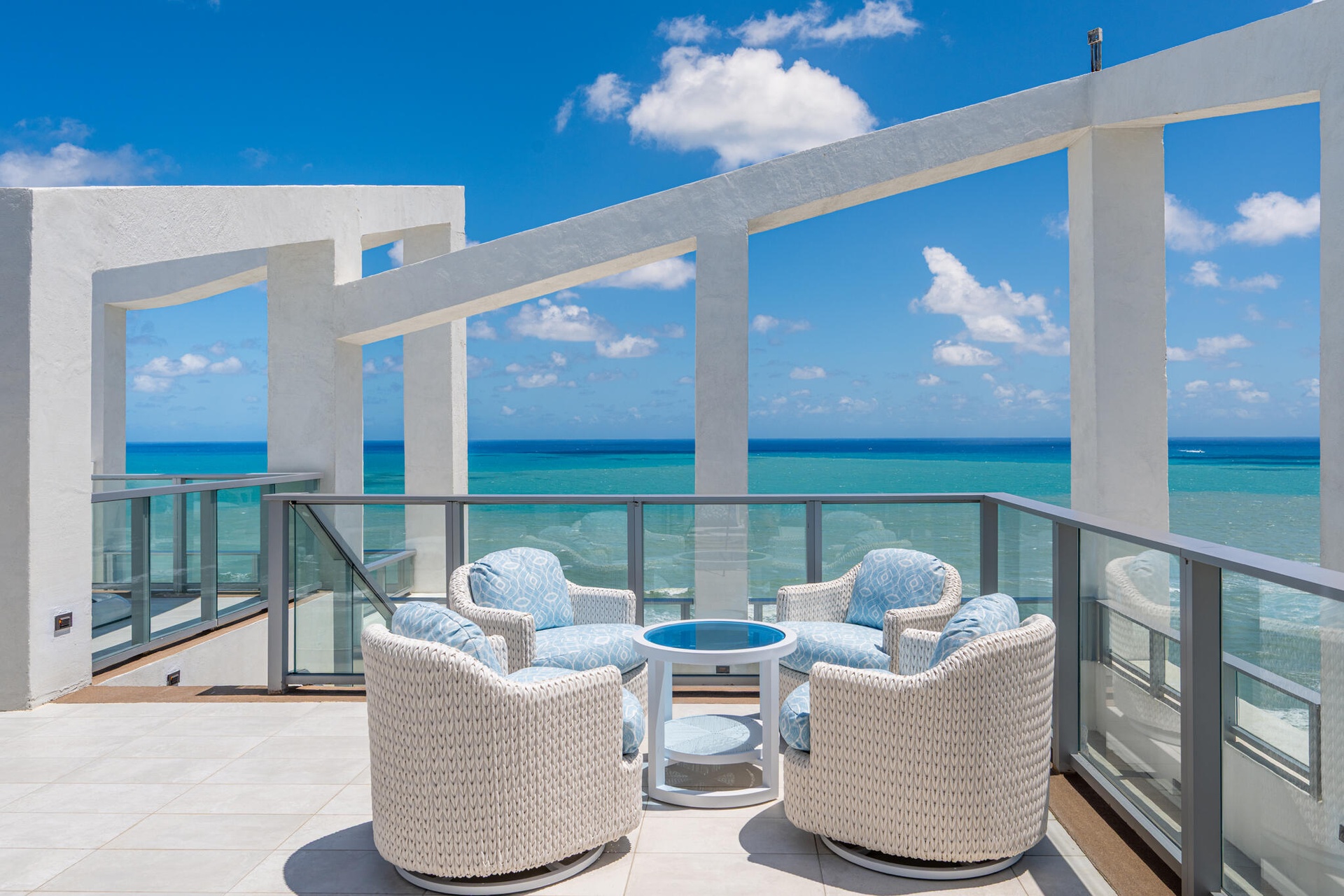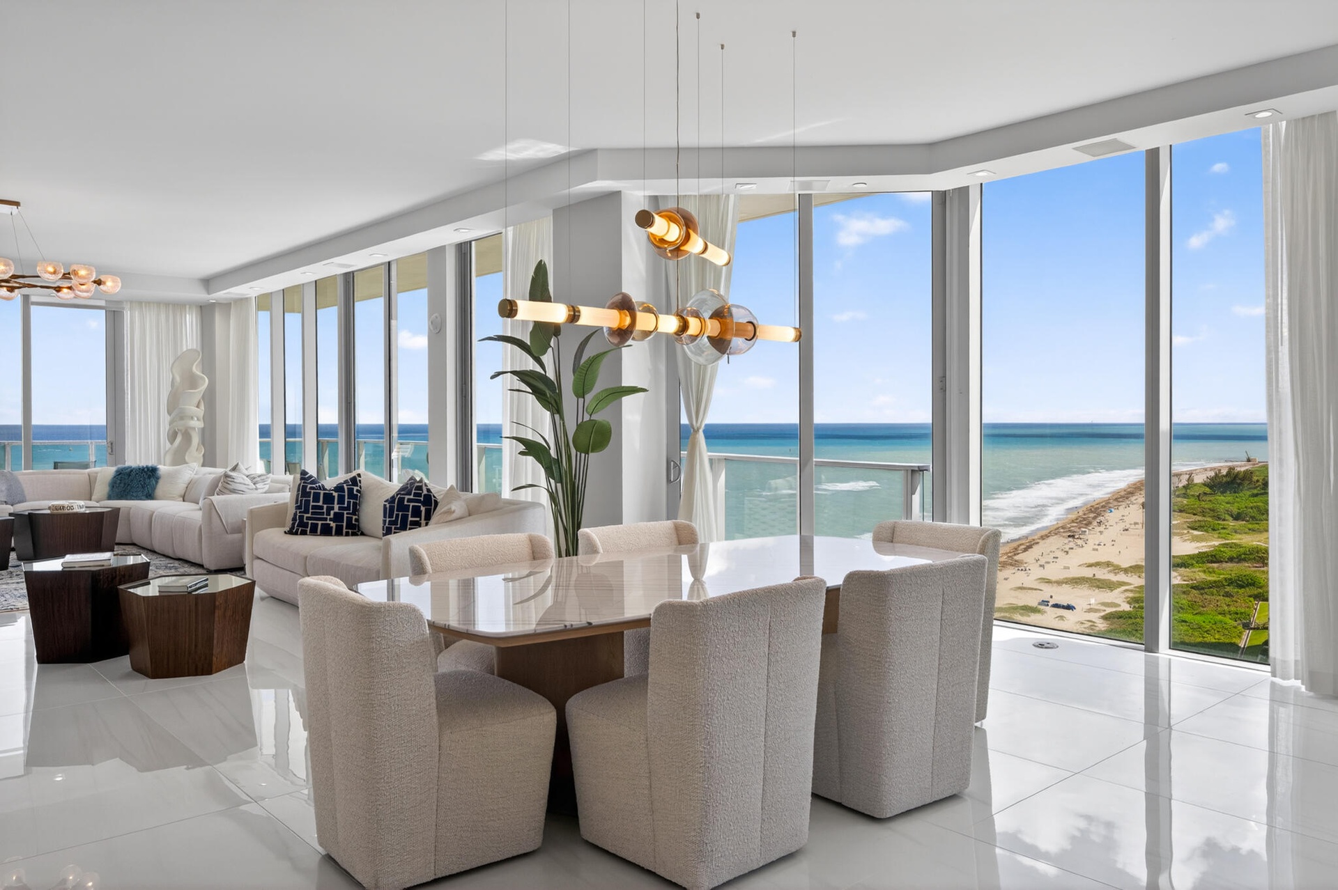 20 floors above the coastline, this one-of-a-kind direct oceanfront penthouse offers over 6,000 sq ft of total space and 3,400 sq ft under air, with breathtaking, unobstructed Atlantic views. Thoughtfully designed with custom finishes and top-tier furnishings, it blends sophistication and comfort for elevated coastal living. The 3-bedroom plus den layout features expansive living areas, panoramic ocean views, and a fully integrated smart home system. A standout feature is the private rooftop oasis, accessed via an in-residence lift, complete with dining area, grill, firepit, lounge seating, and hot tub, perfect for sunset entertaining. Ideally located near Palm Beach Island, Jupiter and PGA Boulevard.