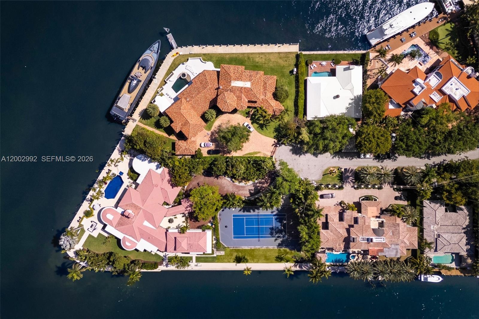Outside, enjoy a resurfaced multi-sport court, a refinished pool with new equipment, a modernized dock with 550 feet of dockage, and lush landscaping with enchanting lighting. Additional upgrades include a new Allini water purification system, enhanced natural gas lines, a renovated garage, and state-of-the-art security.