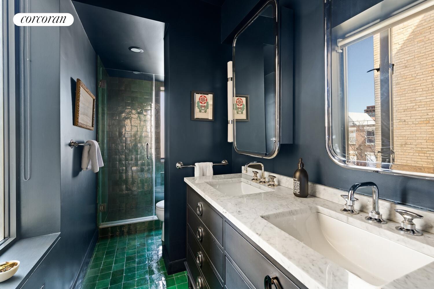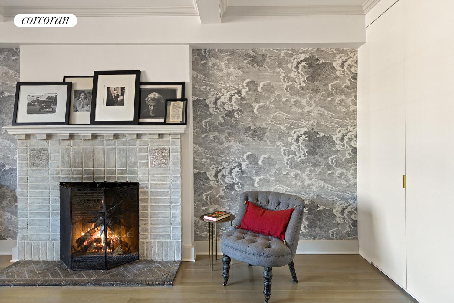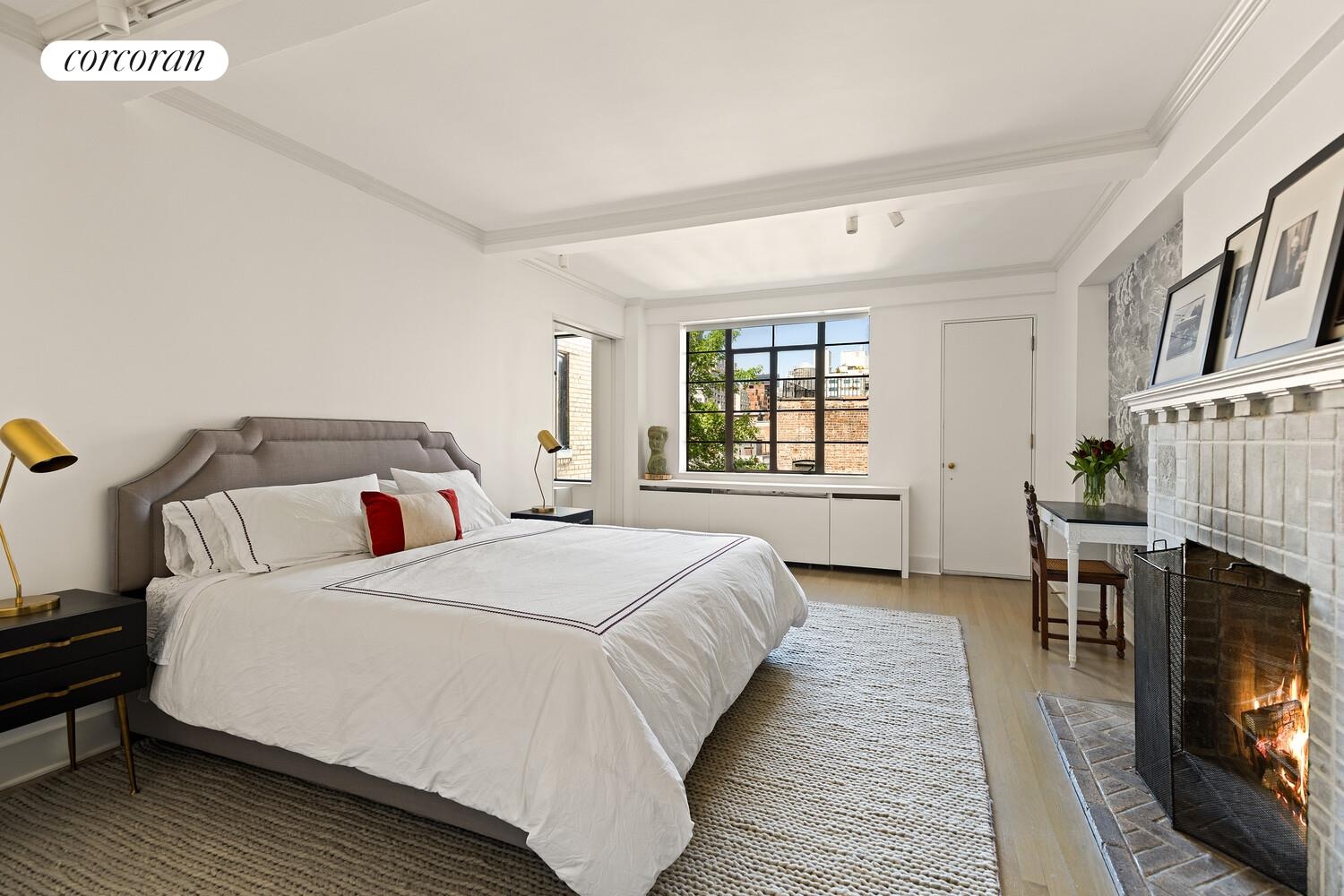 The expansive primary suite features another wood-burning fireplace, a wall of custom built-in closets, and a luxurious ensuite bath complete with a Carrara marble, custom-built dual vanity and rich, bottle green stone finishes from Mosaic House. The second bedroom is bright and airy, with north and west exposures, charming treetop views, and generous closet space. A sun-drenched bathroom with striped Moroccan tile floors sits adjacent to the bedroom.
