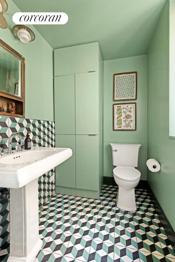 Additional highlights include a playful powder room featuring tilework from Mosaic House, in-unit washer and dryer, through-the-wall air conditioning, beamed ceilings, and windows in every room that fill the home with natural light.