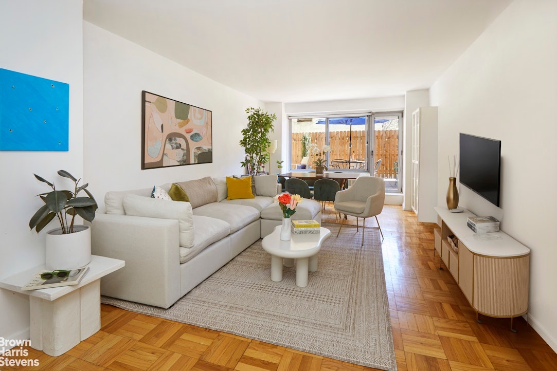Upon entry, you are greeted with a 26-foot long great room with the backdrop of your own Southeast-facing private terrace (approx. 300 SF). This large room offers distinct spaces for both a spacious living room and comfortable dining area with easy access to the terrace for a peaceful retreat in the heart of Greenwich Village.
