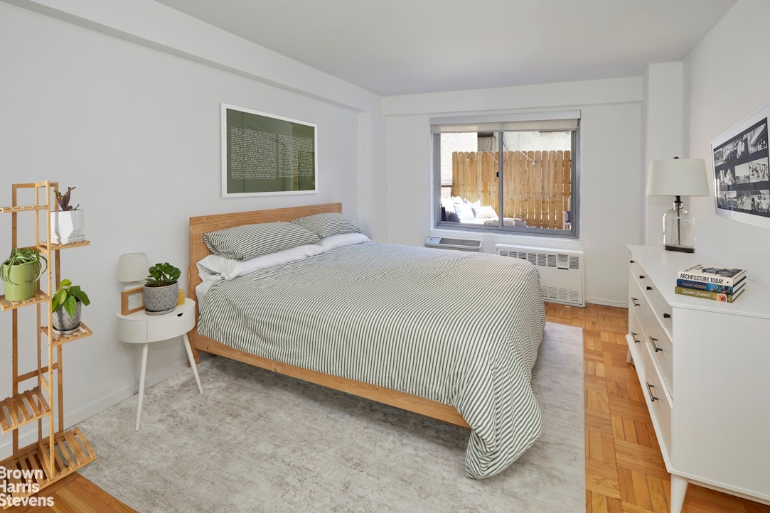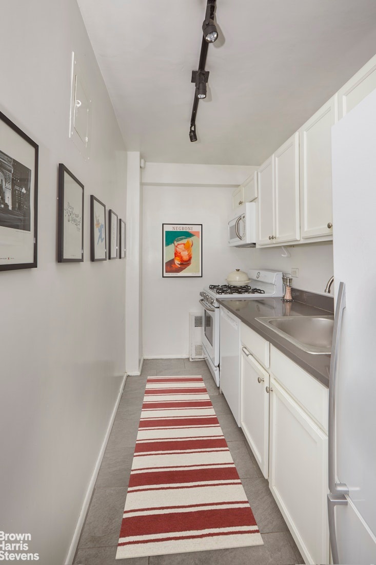 The large bedroom facing the tranquil terrace is spacious enough for a king-size bedroom set, dressers and a desk so you can WFH. The long separate kitchen is fitted with white-on-white appliances complimenting the white cabinets and large quartz countertops. Adjacent to the bedroom, the bathroom features a newly reglazed iron cast shower tub and stone tile floor throughout. Along with 5 closets and hard oak floors complete this lovely home.