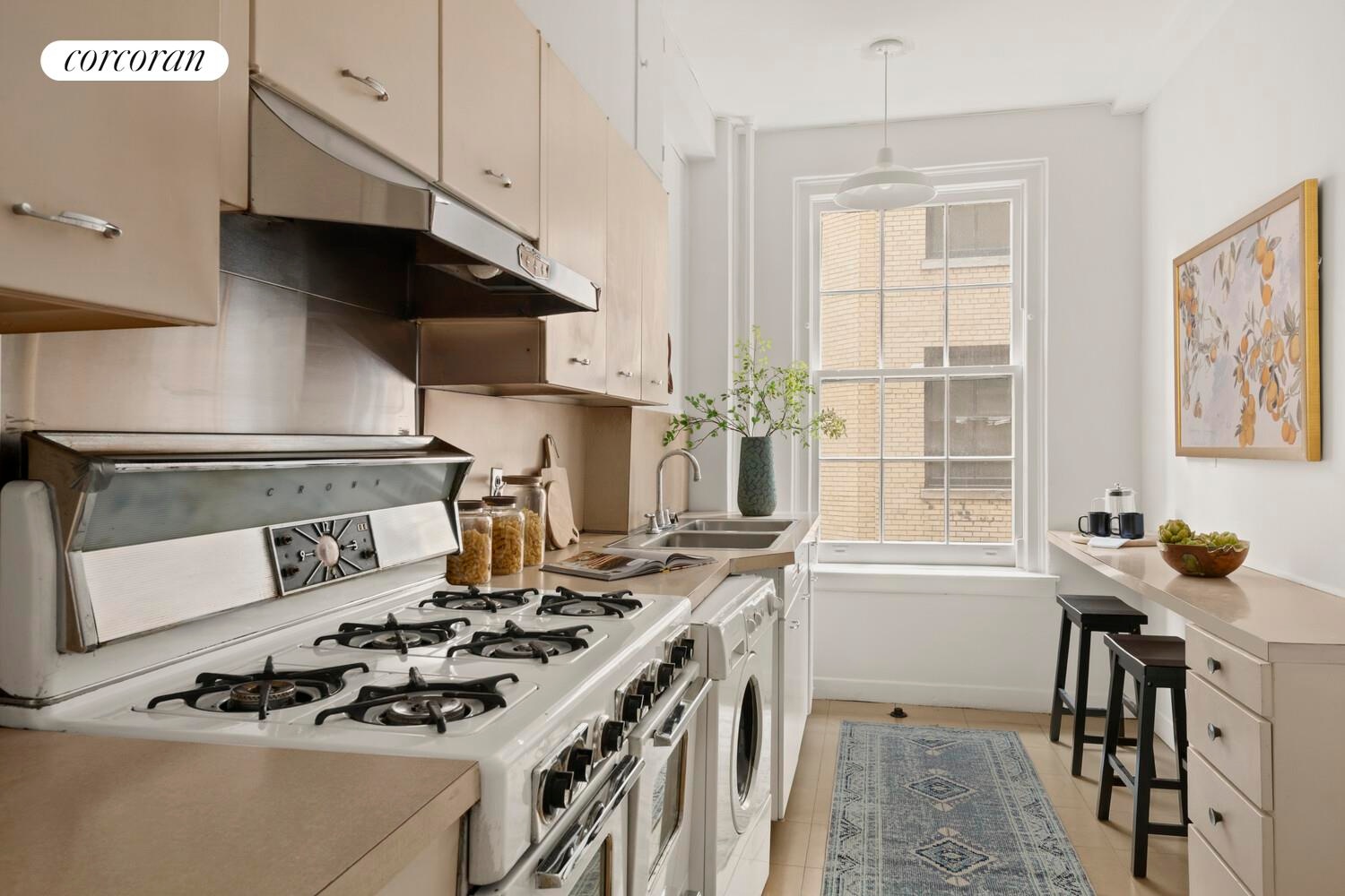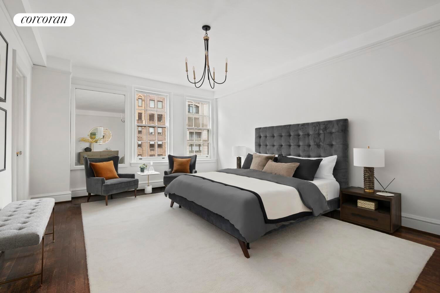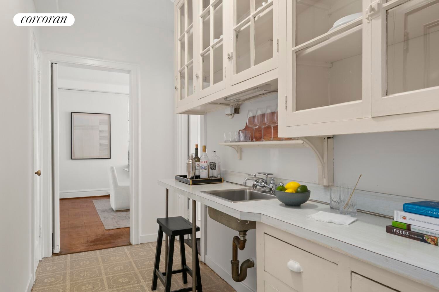 The rear of the apartment offers meaningful flexibility, including the opportunity to reimagine the kitchen and adjoining staff room into a substantial eat-in kitchen tailored to today's lifestyle. A second generously sized staff room allows for a variety of additional uses, whether as a home office, expanded service area, or a well-appointed laundry room.