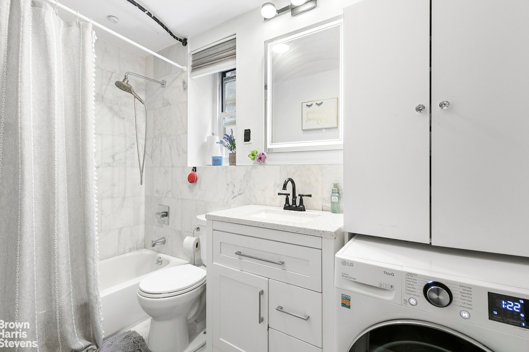 The renovated windowed bathroom features clean, modern finishes and the convenience of an in-unit washer/dryer, a true standout for this price point.