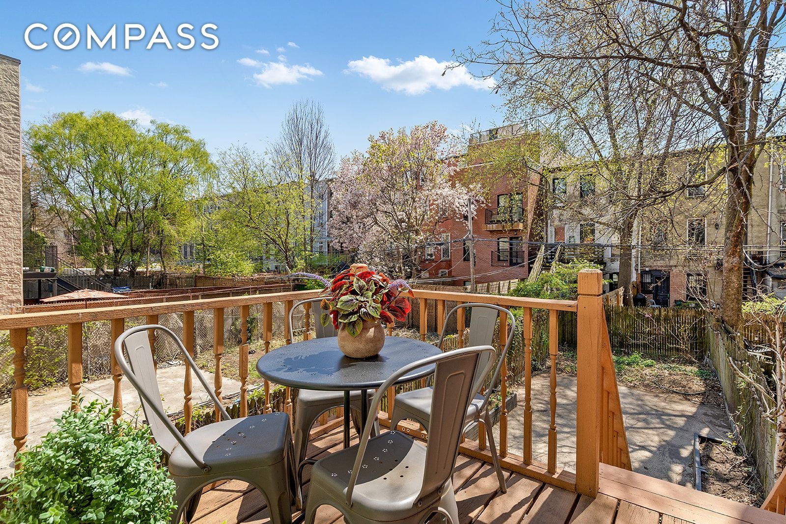 The renovated open kitchen features a large island that serves as both a practical workspace and a natural gathering spot for entertaining. A beautifully appointed powder room on the parlor floor is thoughtfully designed for guests’ convenience. Step through the back door onto a deck for dining al fresco while overlooking the spacious private backyard.