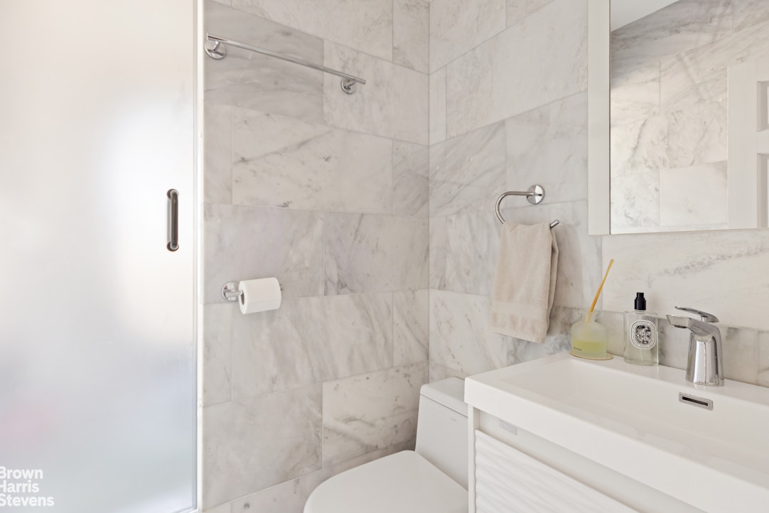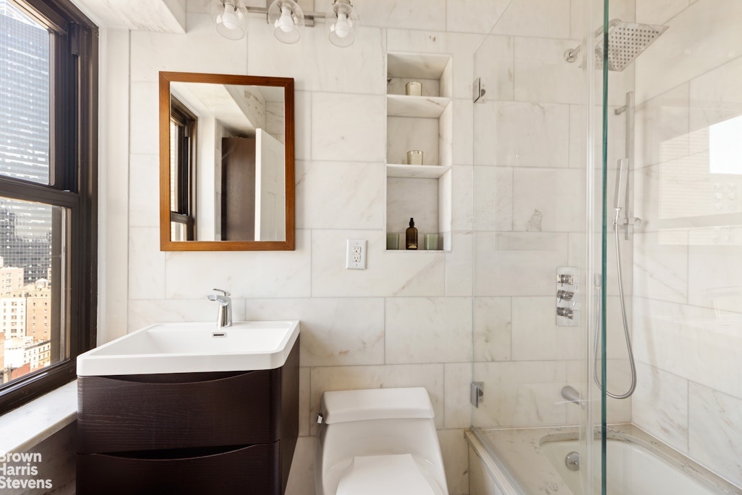 This high floor spacious two bedroom, one and a half bath home has been totally transformed, with no details spared. An inviting home features an entry foyer that leads to a dining area and very spacious living room with great light and northern cityscape views. Watch the lights change color at the Empire State building from the den or 2nd bedroom as well as the double windowed kitchen, and windowed primary bedroom with amazing western views. The beautifully renovated and well-designed kitchen has custom cabinetry, quartzite countertops and backsplash, stainless appliances, washer/dryer and a breakfast bar to sip your coffee while taking in the views. Both the primary bath and powder room are finished in Carrera marble with elegant fixtures and spa-like details including thermostatic controlled rain and hand held shower. Cleverly designed, your guests can access the bathtub from a door in the powder room. The primary bedroom is currently configured with a wall and pocket door that separates the sleeping area from a dedicated nursery. Easy to remove, it would fit a king sized bed and more. From the beautiful oak hardwood floors, pocket doors, custom lighting, thermostats in all rooms, decorative molding and plenty of closets, just bring your personal stuff and move on in!