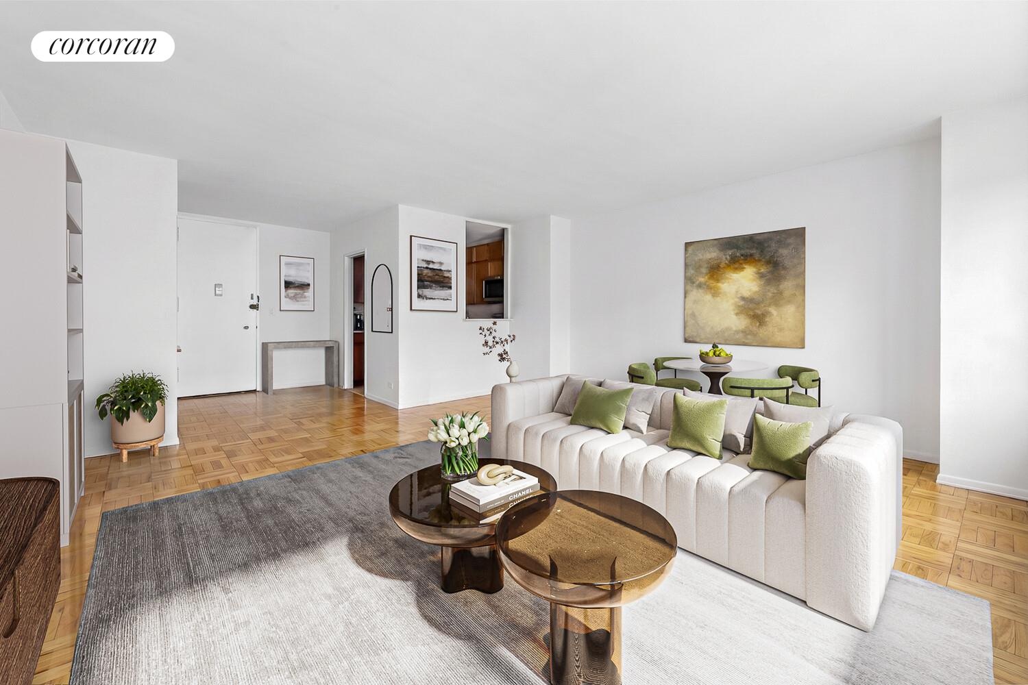 Immediately upon entry, you are greeted by abundant natural light flooding this spacious South East-facing corner unit! A seamless flow with an outstanding balance of space, including an entry foyer with a large coat closet, a spacious living room to furnish to your liking without compromise, a primary bedroom that can accommodate your desired (king-sized) furniture, and more, offering two roomy closets.