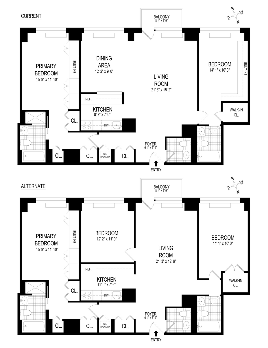 Rarely available, high floor, Split 2 bedroom, 2.5 bath home with all South facing windows and private balcony! This spacious home has two king-sized bedrooms, both boasting custom built-ins and renovated ensuite bathrooms. The renovated kitchen has stainless steel appliances including a wine fridge, tiled floors and a pass thru into the dining area. If a third bedroom/home office is what you desire, please see the alternate floor plan to make that happen! There are many closets, all outfitted, views of the river and the ability to install a w/d where plumbing currently exists! Reach out for your private showing today as this home will not last on the market long!