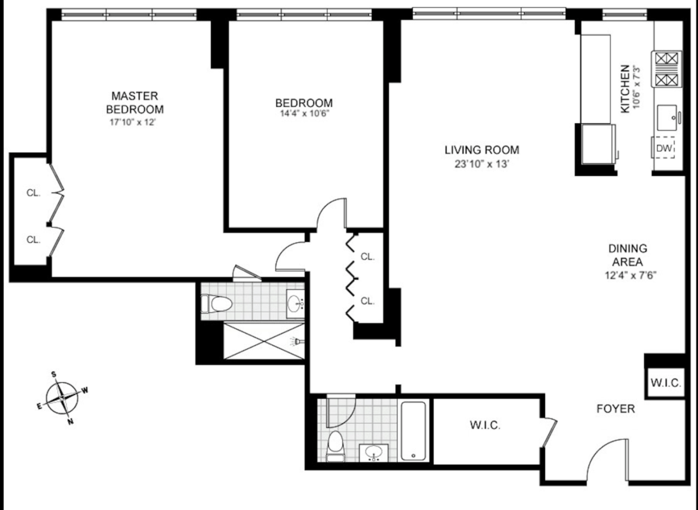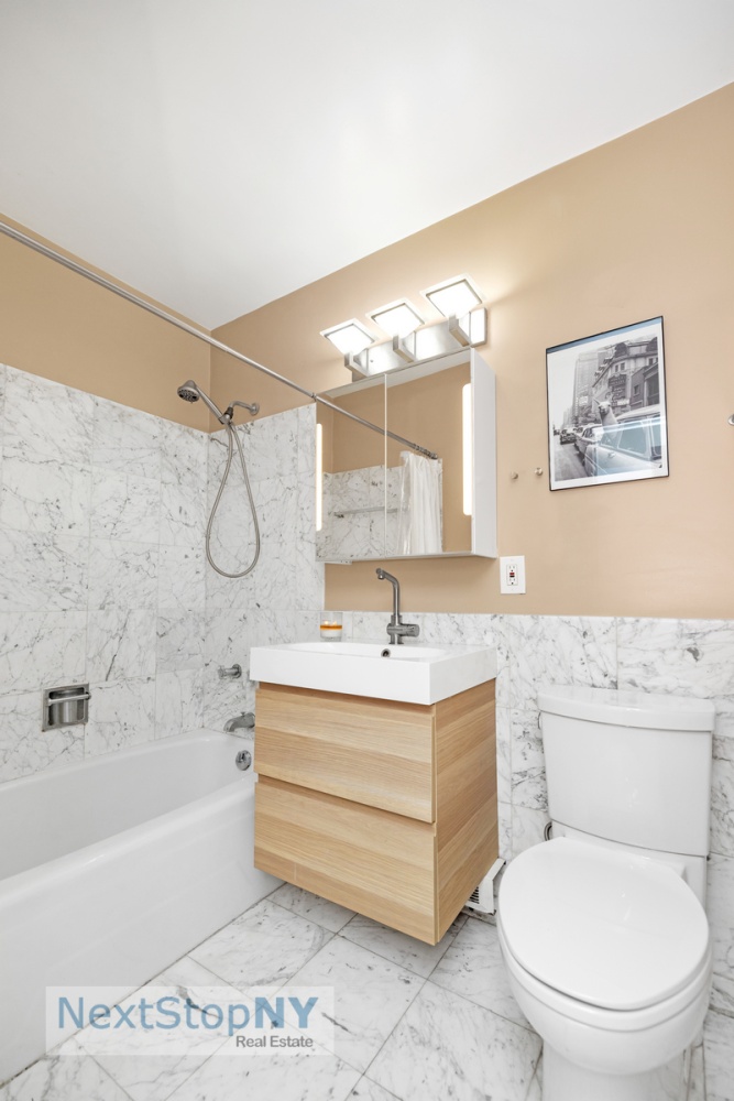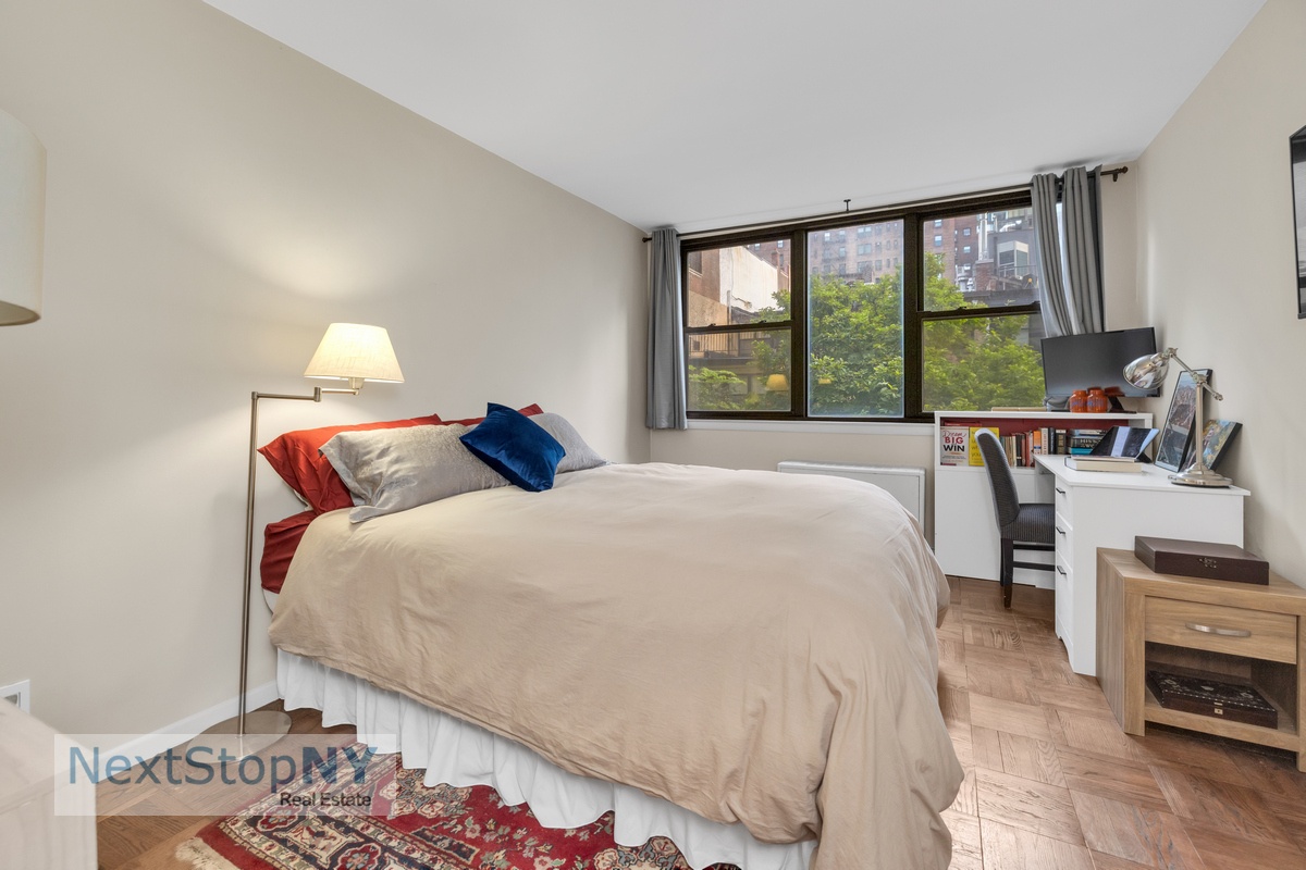 The king-sized primary suite is a true retreat, featuring generous proportions, multiple closets, and a luxurious Calacatta marble en-suite bath. The second bedroom is equally versatile-ideal as a guest room, home office, or both-with a beautifully renovated marble bath just outside. In total, the residence offers five closets, including two oversized walk-ins.