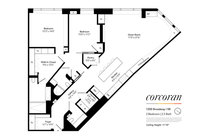 Located at 1200 Broadway, Apartment 5B spans approximately 2,170 square feet (per offering plan) and is defined by soaring 11'10" ceilings, expansive proportions, and open southern exposures that flood the home with natural light throughout the day.
