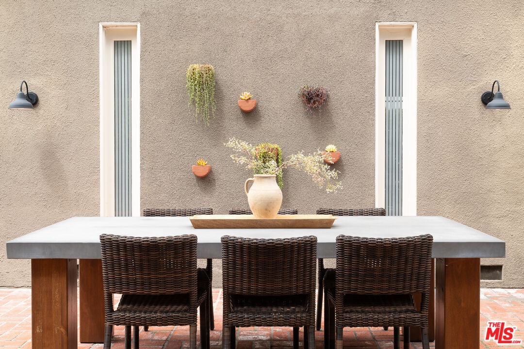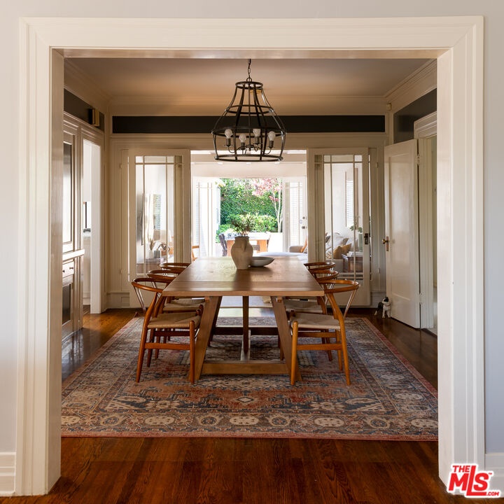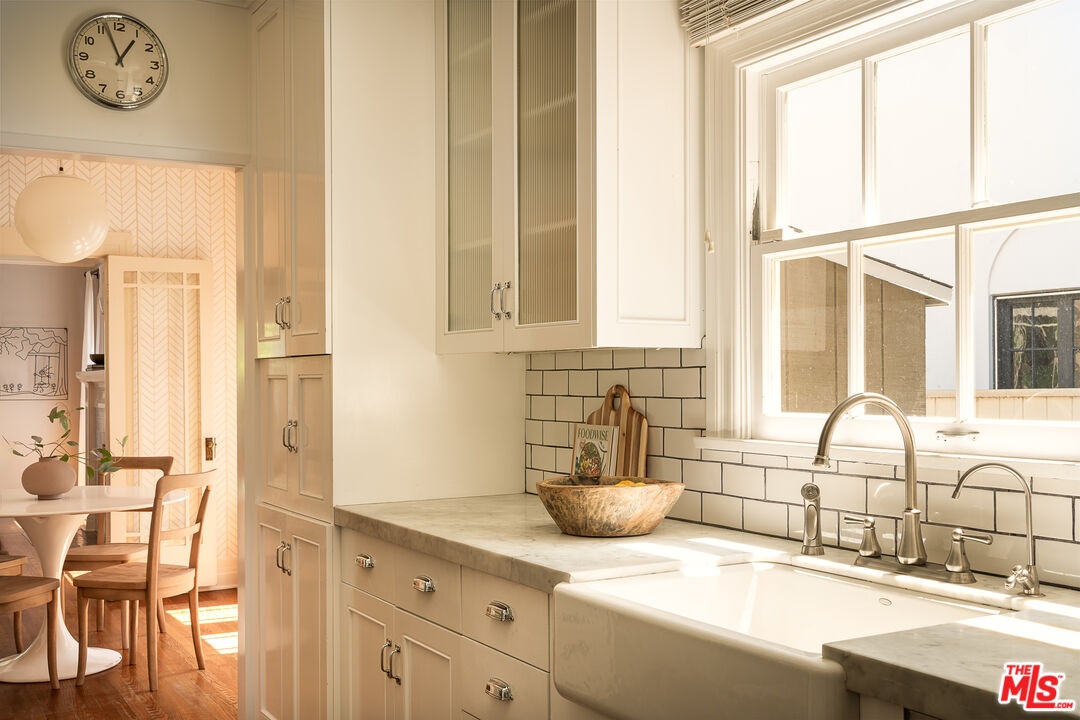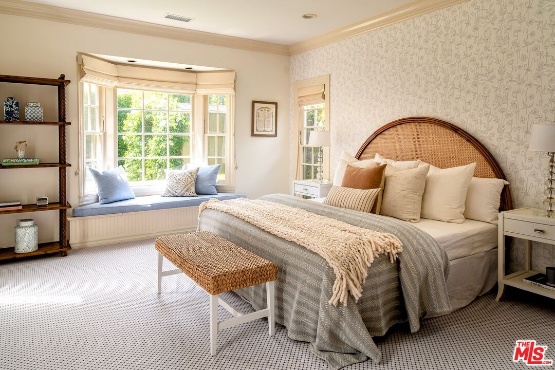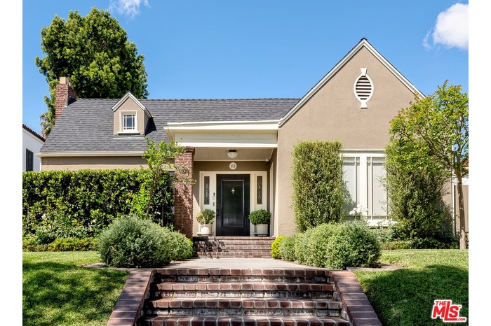 A graceful reinvention of classic English Country style in the heart of Larchmont Village, this exceptional 1920s residence blends timeless architecture with thoughtful modern updates. Rich in character and exquisite detail, the home offers effortless single-level living with seamless indoor-outdoor flow. The expansive living room features a custom-tiled fireplace, while the renovated chef's kitchen boasts a breakfast bar, built-in desk, and designer finishes. A formal dining room and charming breakfast room with classic built-ins provide inviting spaces for both everyday living and entertaining. A separate laundry room and beautifully styled powder room offer direct access to the stunning backyard. Two generously sized guest bedrooms, each with its own bath, are thoughtfully positioned for privacy, separate from the primary suite. The open-beamed family room and expanded primary retreat complete with a spacious walk-in closet and luxurious bath overlook the terrace, lush lawn, and gardens. Completing the property is a newer detached guest house with wood-beamed ceilings, loft space, custom built-ins, and a private bath ideal for guests, a sophisticated home office, or playroom. The expansive grounds offer ample room for a pool, presenting endless possibilities at this truly unforgettable Larchmont residence.