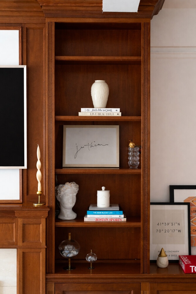 Approximately 9-foot beamed ceilings, hardwood floors, custom mahogany built-ins, and a wood-burning fireplace create a warm, classic backdrop. The king-size, south-facing bedroom is filled with natural light throughout the day, while the expansive living and dining footprint offers multiple layout options as needs evolve. The bathroom has been recently renovated.