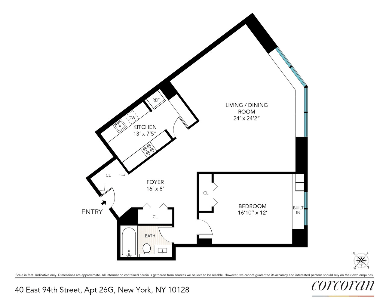Expansive wrap-around views and light fill this beautiful 1BR/1BA Carnegie Hill condo. The unusually large entry and living room are an unexpected pleasure in a Manhattan one bedroom apartment. There is a large and comfortable bedroom and excellent closet space throughout. The spacious galley kitchen provides a great deal of storage, as well as options for new layouts. This apartment comes with a storage unit which is 4x4x4.
