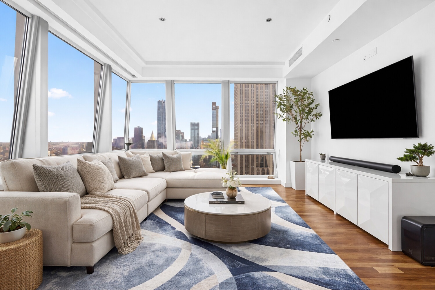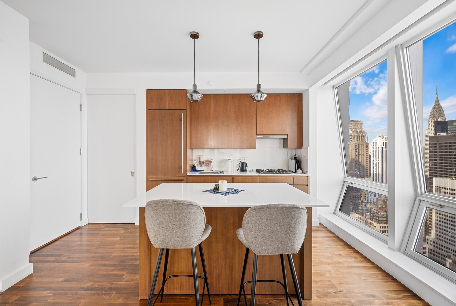 Perched high above Fifth Avenue, Residence 46A is a striking corner two-bedroom, two-and-a-half-bathroom home offering breathtaking, unobstructed views of the Empire State Building, Chrysler Building, and both rivers through 15 oversized windows with prized East and South exposures.