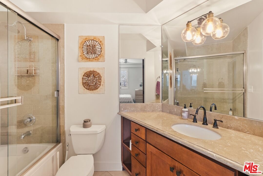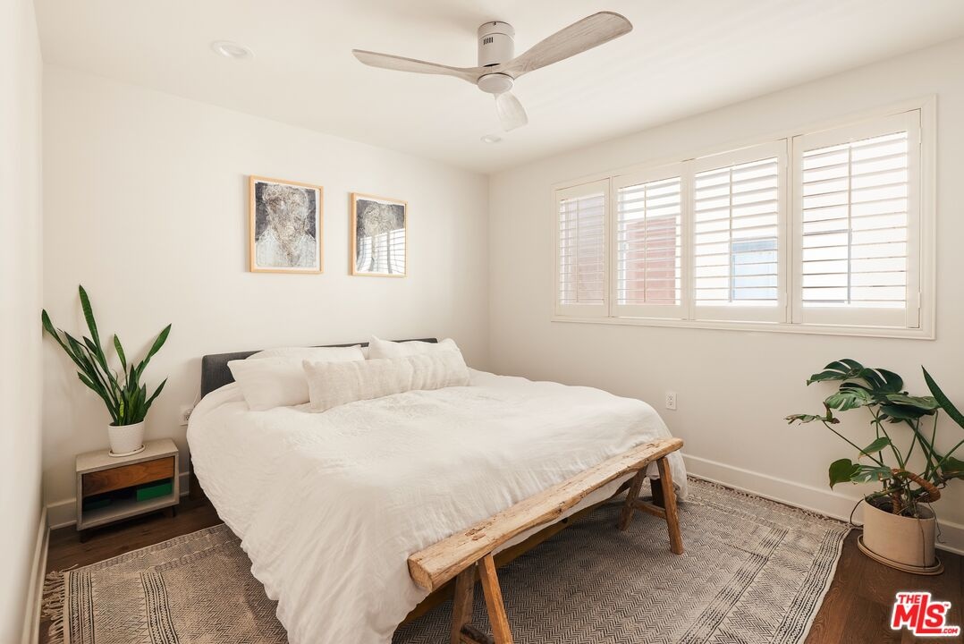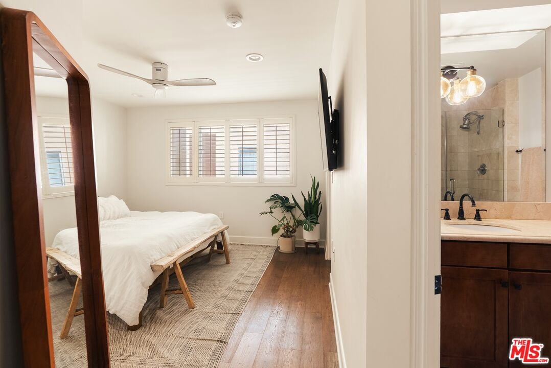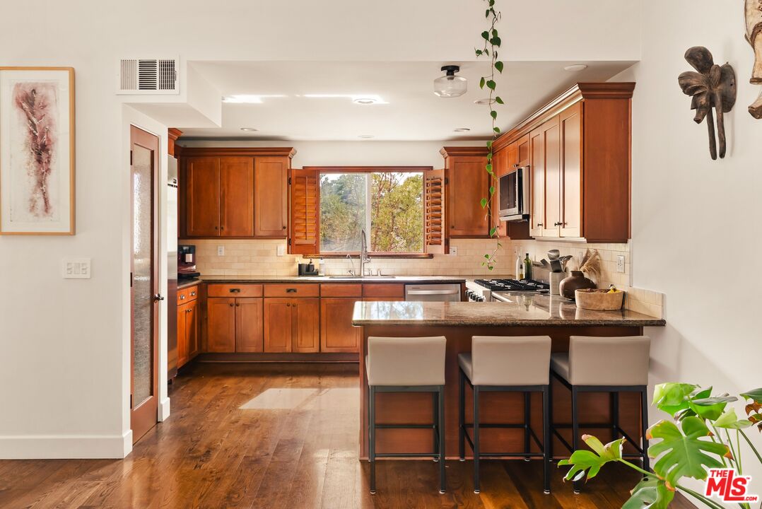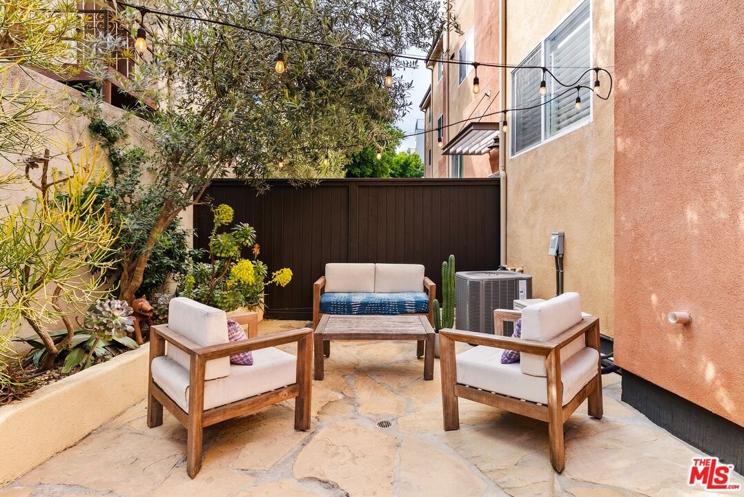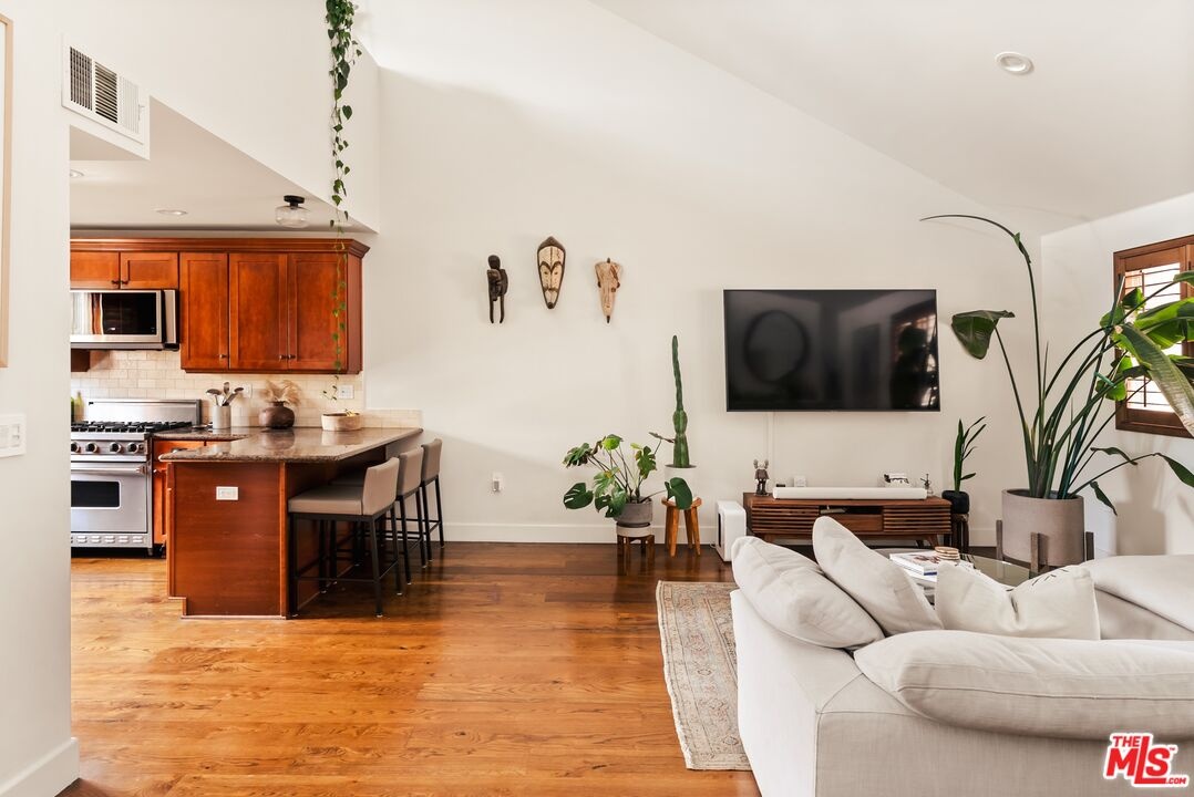Set on a peaceful, tree-lined street in the heart of Mar Vista, this beautifully appointed townhome blends thoughtful design with everyday comfort, enhanced by tasteful upgrades throughout. Offering 2 bedrooms, 2 bathrooms, and a spacious loft, the light-filled interior feels warm, inviting, and effortlessly versatile. The main living area showcases dramatic ceilings, rich hardwood floors, and a charming fireplace that anchors the space. The kitchen is well-suited for both daily living and entertaining, featuring a 6-burner Viking range, stainless steel appliances, a walk-in pantry, reverse osmosis water filtration system, and ample storage. The generous primary suite offers a walk-in closet and a serene en suite bath, while the second bedroom also includes ample closet space and its own en suite bathroom with a soaking tub. Upstairs, the loft provides flexibility as a home office, gym, or creative space, with the option to function as a third bedroom. An oversized flagstone patio, framed by lush drought-tolerant landscaping, offers the perfect setting for outdoor entertaining or quiet, serene mornings. Additional conveniences include in-unit washer and dryer and a generous bonus storage area, while the private 2-car garage equipped with EV charging capability completes the home. Ideally located just minutes from popular restaurants, coffee shops, and neighborhood favorites, this home offers the best of Westside living in one of its most walkable communities.