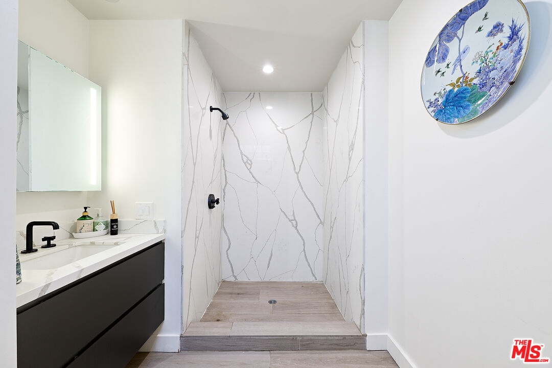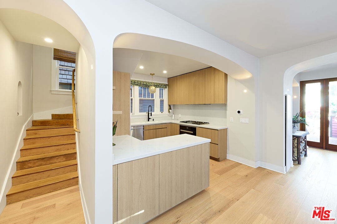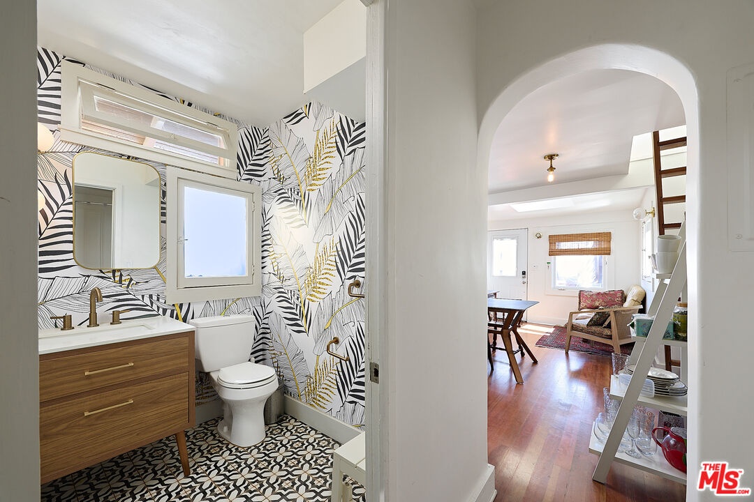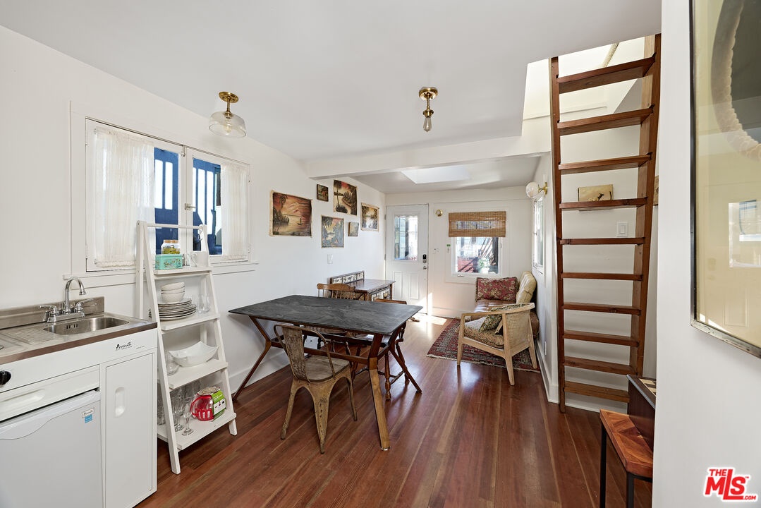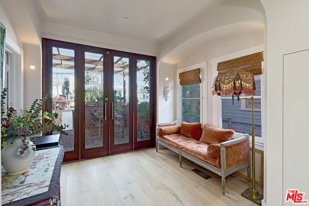 This iconic walk street Craftsman, just moments from the sand, has been thoughtfully reimagined creating a timeless coastal retreat. This rare 5-bedroom, 3-bathroom residence offers a beautifully curated living experience that honors its classic roots while embracing contemporary design. At the heart of the home, a fully redesigned kitchen showcases premium Fisher & Paykel and Miele appliances, seamlessly connecting to a spacious rear deck - perfect for indoor-outdoor gatherings. Newly installed hardwood floors on the main level pair beautifully with the restored original hardwood upstairs, creating a warm aesthetic throughout. The main level features a versatile bedroom or office and a beautifully updated full bath. Upstairs, the tranquil primary suite offers picturesque, tree-lined views, accompanied by two additional bedrooms, two stylishly renovated bathrooms, and a generous family room with sophisticated detailing. A tucked-away loft provides an intimate bonus space, while the expansive rooftop deck captures ocean views. Outdoor living is equally inviting, complete with a private outdoor shower for post-beach days and a rare three-car parking pad. Modern conveniences include a tankless water heater, Pelican whole-house water filtration system, and a comprehensive security system with cameras. With a separate entrance to the upper level, the home also offers flexibility for a private two-bedroom living space. Ideally located near Abbot Kinney, Rose Avenue, the Venice Canals, and an array of beloved dining, shopping, and wine destinations, this exceptional residence embodies the best of Venice living.