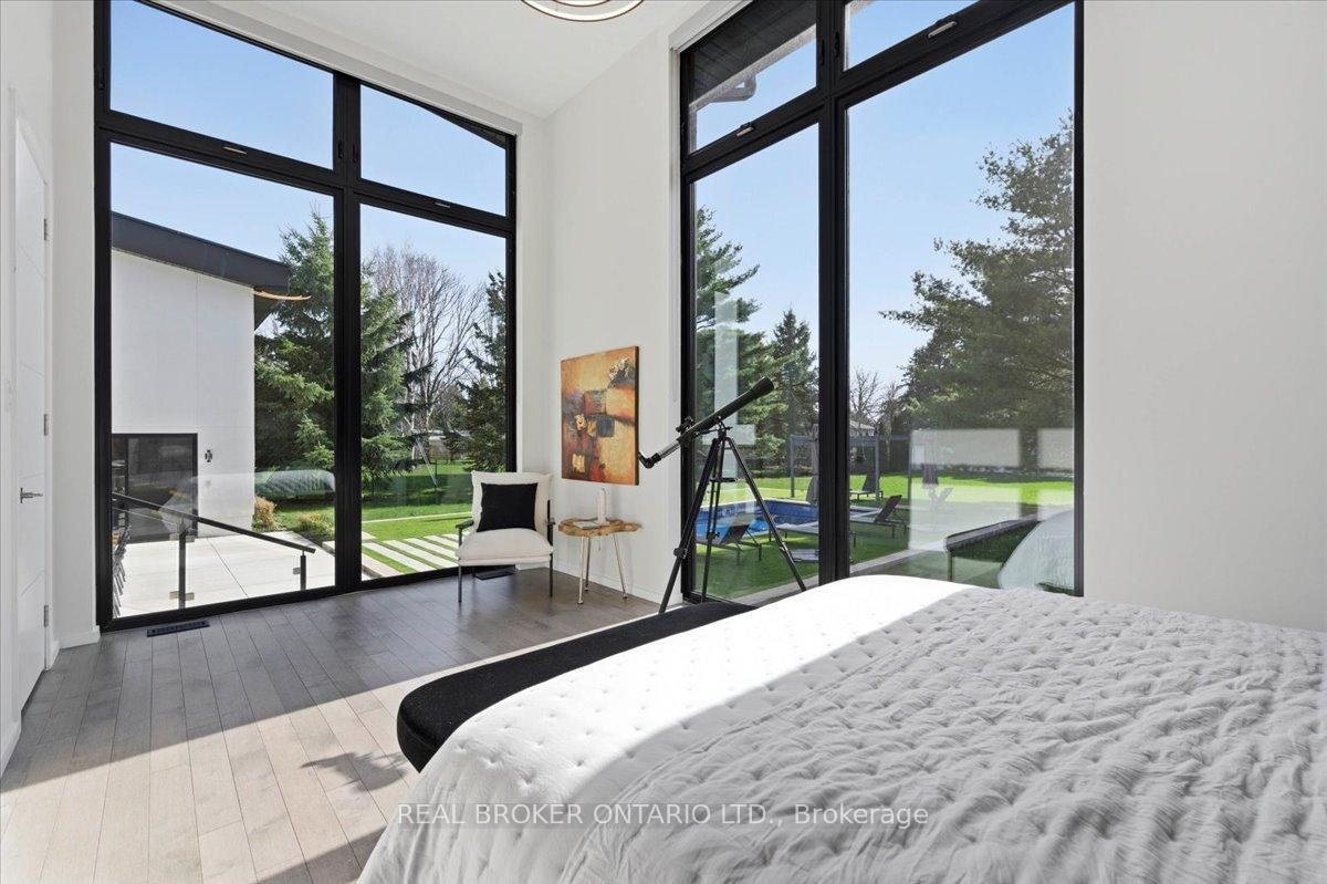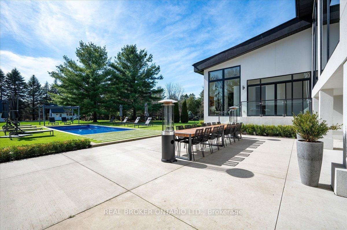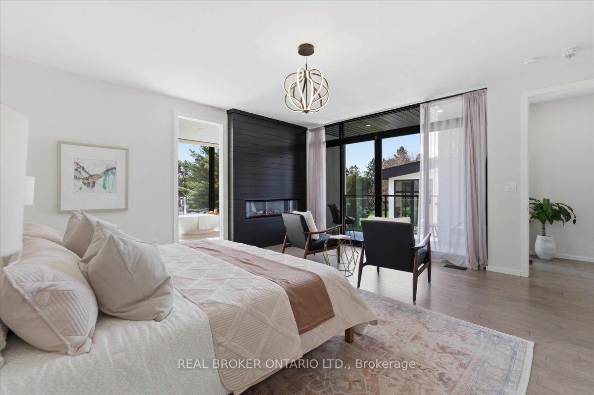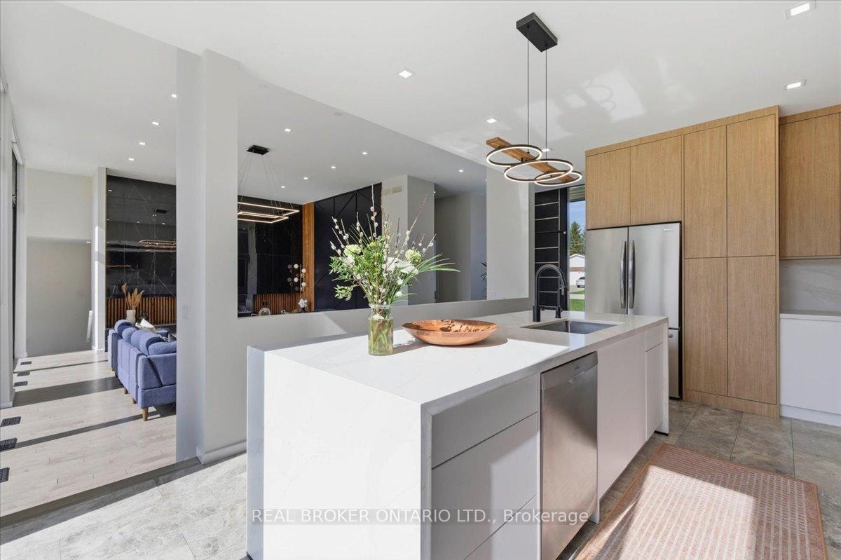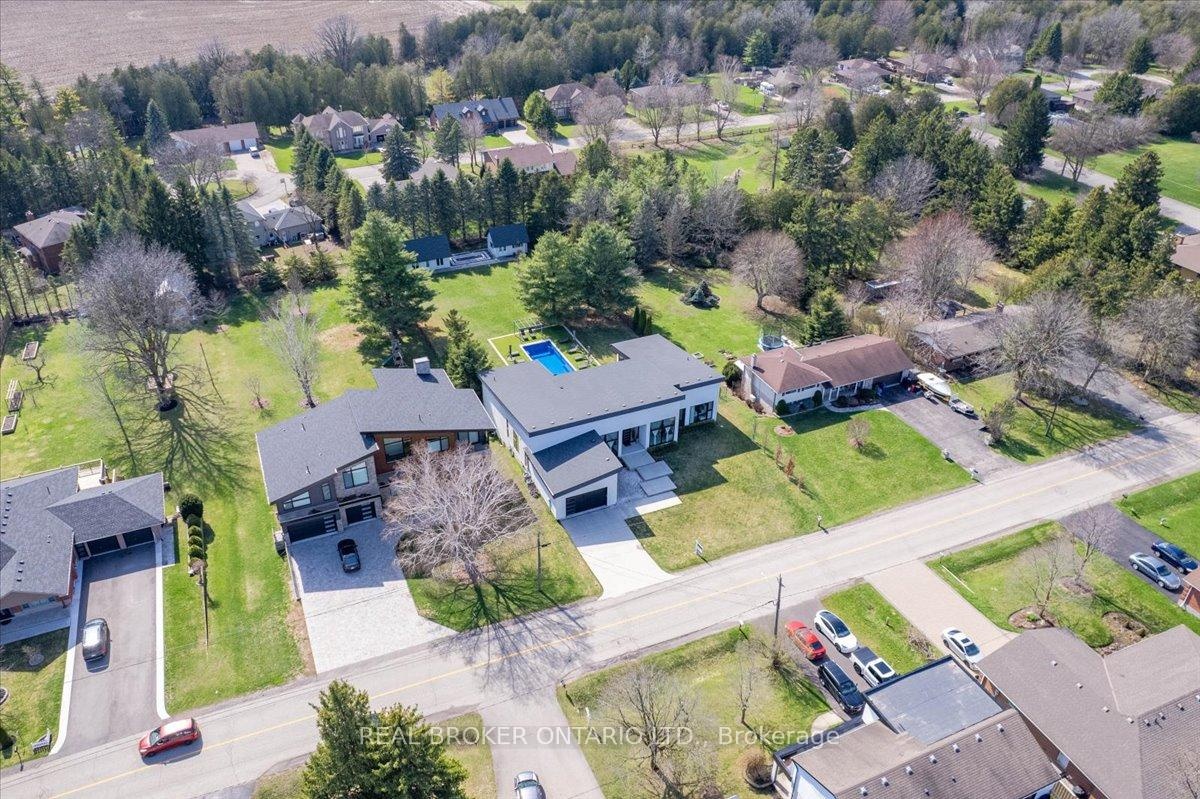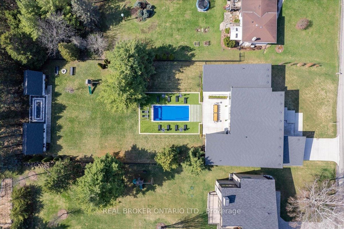 Modern architecture, set within a private acre setting. This custom-built bungalow in Mannheim brings together scale, light, and a seamless connection to the outdoors. Offering nearly 4,000 square feet above grade, the home is defined by clean lines, a full stucco exterior, and an understated yet intentional presence. Inside, 13 ft ceilings carry through the main living area, creating volume without excess. The family room anchors the home, where a statement fireplace set against a marble feature wall defines the space, while a full wall of glass frames uninterrupted views of the backyard. The outdoors becomes part of the everyday experience. The kitchen sits at the centre, refined and functional, with a waterfall-edge island and integrated finishes that support the space without overpowering it. With 5 bedrooms, 3 full bathrooms, and a dedicated office, the layout offers both separation and flexibility. The primary suite is set apart as a private retreat, positioned to take full advantage of the property. Elevated views extend over the backyard, with a private balcony that continues that connection outdoors, while the ensuite carries it further with a freestanding tub and glass shower. It's a space that feels quiet, intentional, and removed from the rest of the home. Additional space below offers 2,700 square feet ready to be shaped into wellness, recreation, or extended living. The backyard is where everything comes together. Set on a wide, tree-lined and fully fenced acre lot, the outdoor space is arranged around a saltwater pool with an automatic Coverstar safety cover, with multiple areas for dining, lounging, and gathering. A detached workshop, currently used as a golf simulator, and a separate storage shed add flexibility beyond the home. A two-car garage, equipped for electric vehicle charging, adds everyday convenience. Located just minutes from Kitchener-Waterloo, the setting offers privacy without compromise.