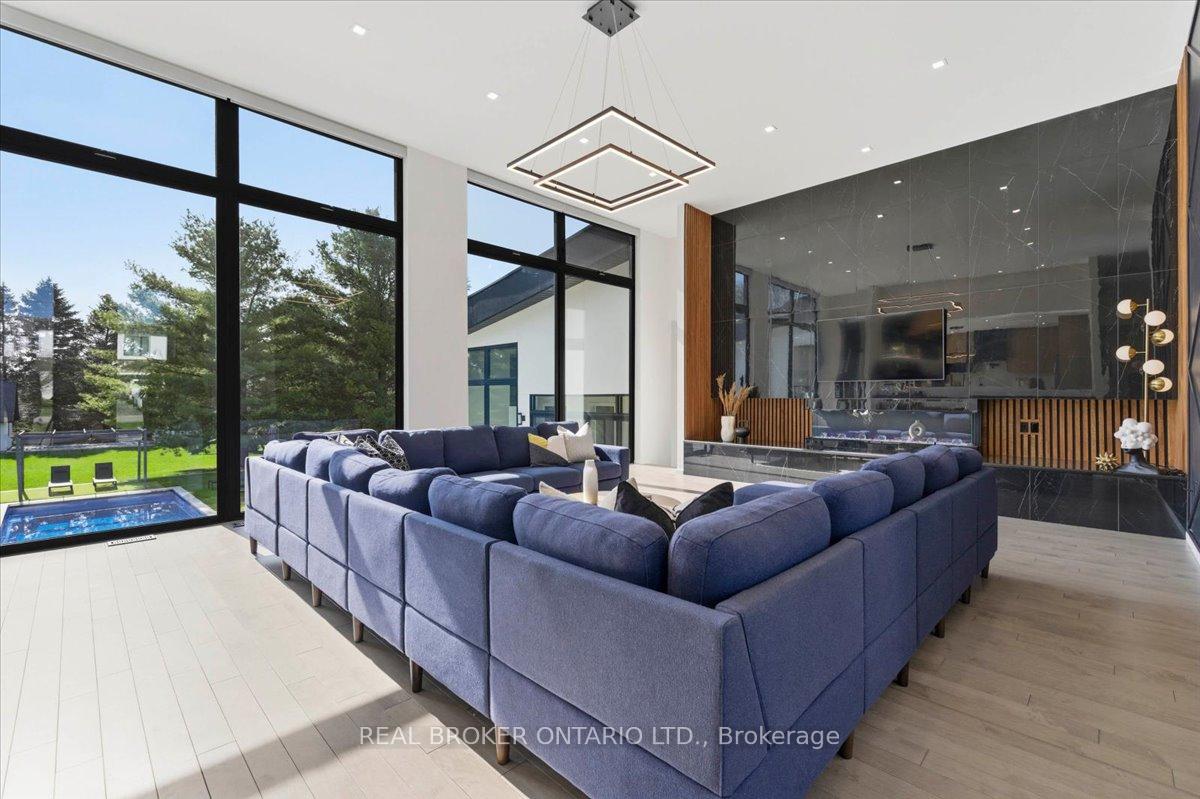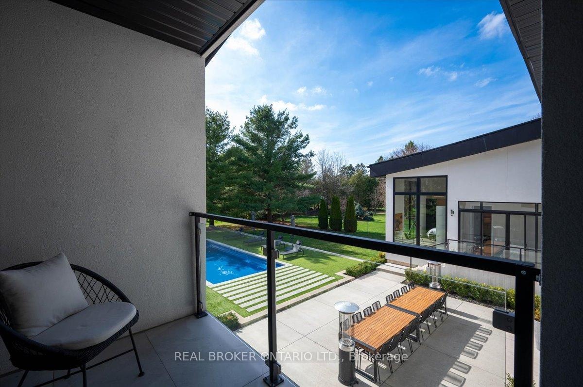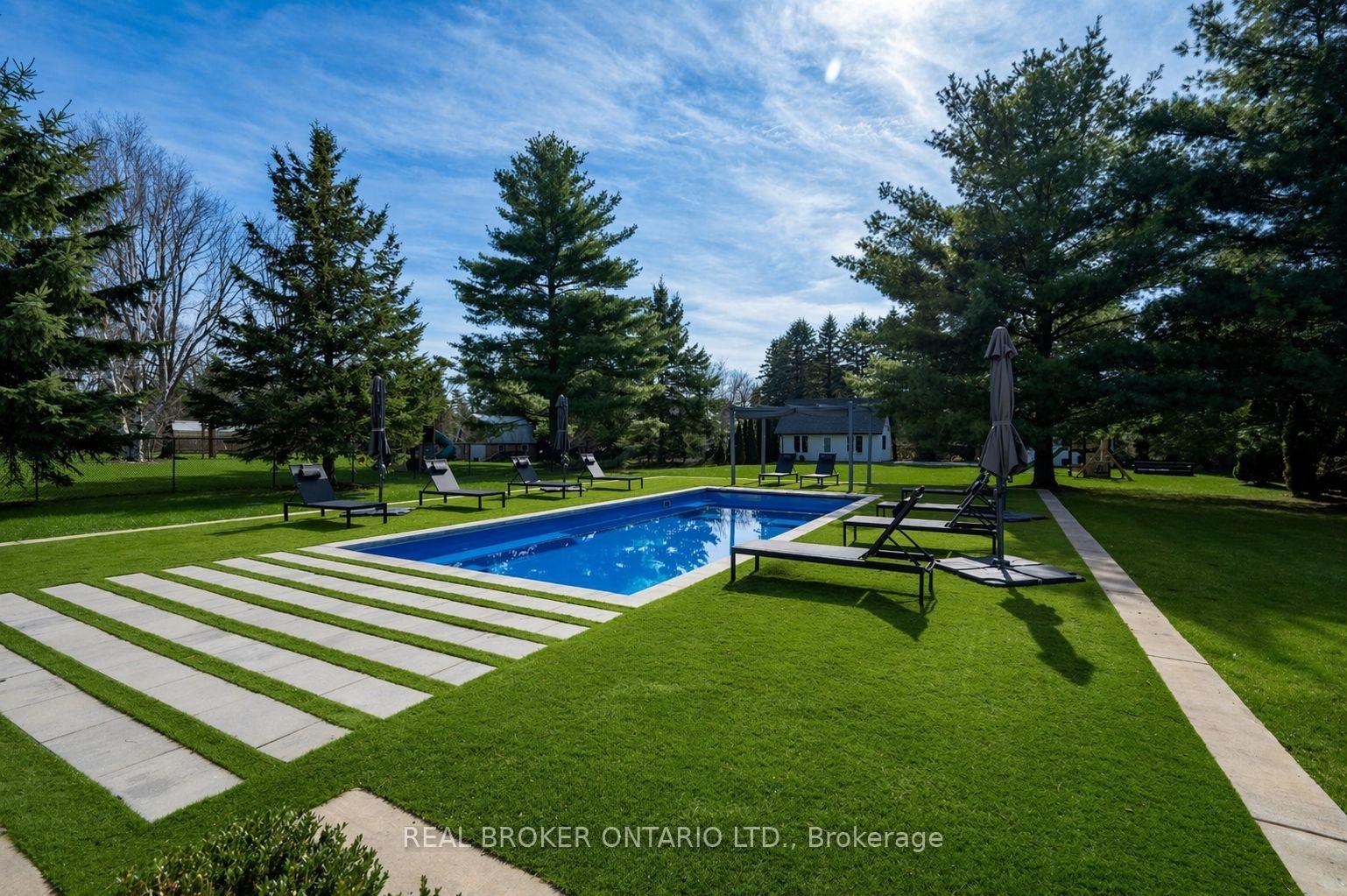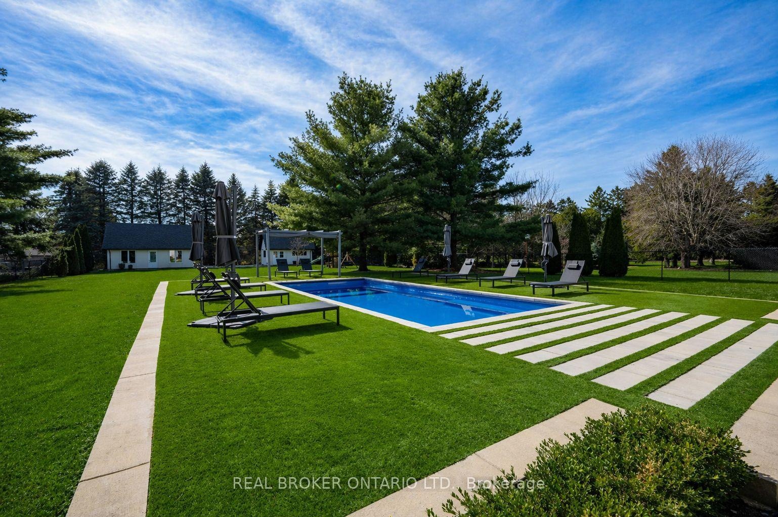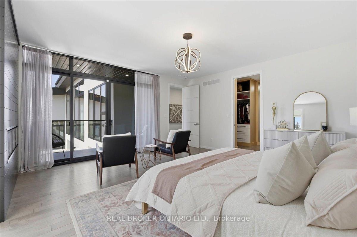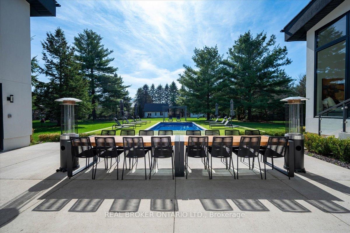 Modern architecture, set within a private acre setting. This custom-built bungalow in Mannheim brings together scale, light, and a seamless connection to the outdoors. Offering nearly 4,000 square feet above grade, the home is defined by clean lines, a full stucco exterior, and an understated yet intentional presence. Inside, 13 ft ceilings carry through the main living area, creating volume without excess. The family room anchors the home, where a statement fireplace set against a marble feature wall defines the space, while a full wall of glass frames uninterrupted views of the backyard. The outdoors becomes part of the everyday experience. The kitchen sits at the centre, refined and functional, with a waterfall-edge island and integrated finishes that support the space without overpowering it. With 5 bedrooms, 3 full bathrooms, and a dedicated office, the layout offers both separation and flexibility. The primary suite is set apart as a private retreat, positioned to take full advantage of the property. Elevated views extend over the backyard, with a private balcony that continues that connection outdoors, while the ensuite carries it further with a freestanding tub and glass shower. It's a space that feels quiet, intentional, and removed from the rest of the home. Additional space below offers 2,700 square feet ready to be shaped into wellness, recreation, or extended living. The backyard is where everything comes together. Set on a wide, tree-lined and fully fenced acre lot, the outdoor space is arranged around a saltwater pool with an automatic Coverstar safety cover, with multiple areas for dining, lounging, and gathering. A detached workshop, currently used as a golf simulator, and a separate storage shed add flexibility beyond the home. A two-car garage, equipped for electric vehicle charging, adds everyday convenience. Located just minutes from Kitchener-Waterloo, the setting offers privacy without compromise.