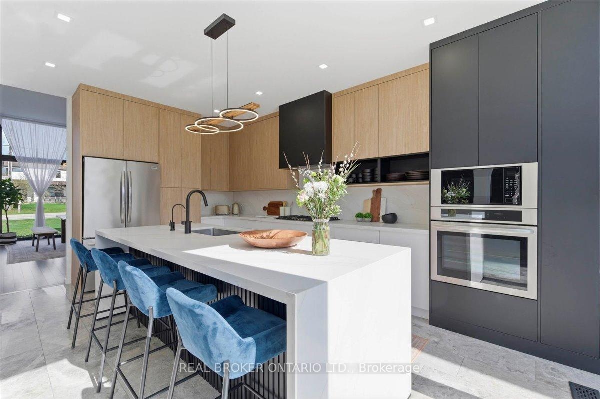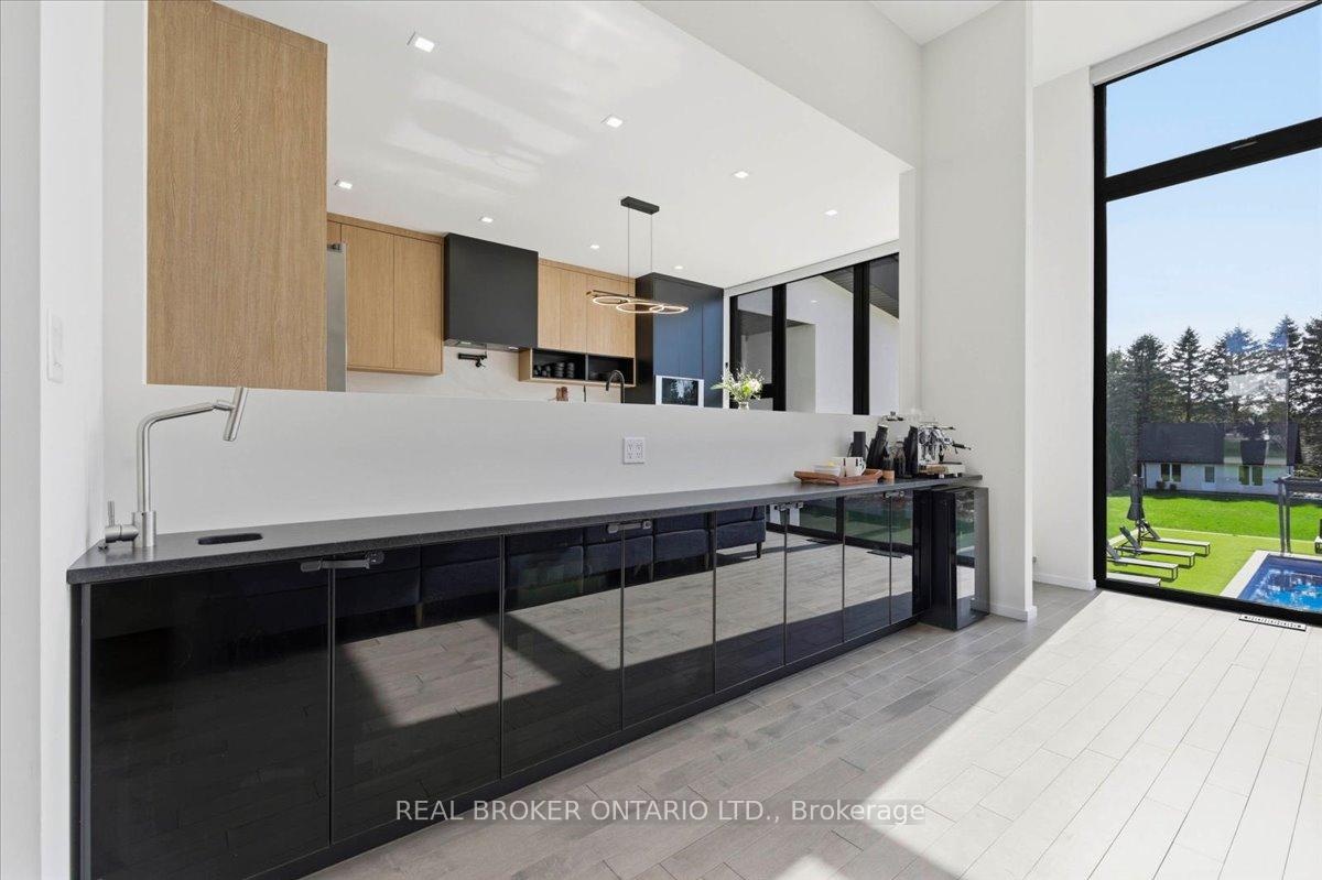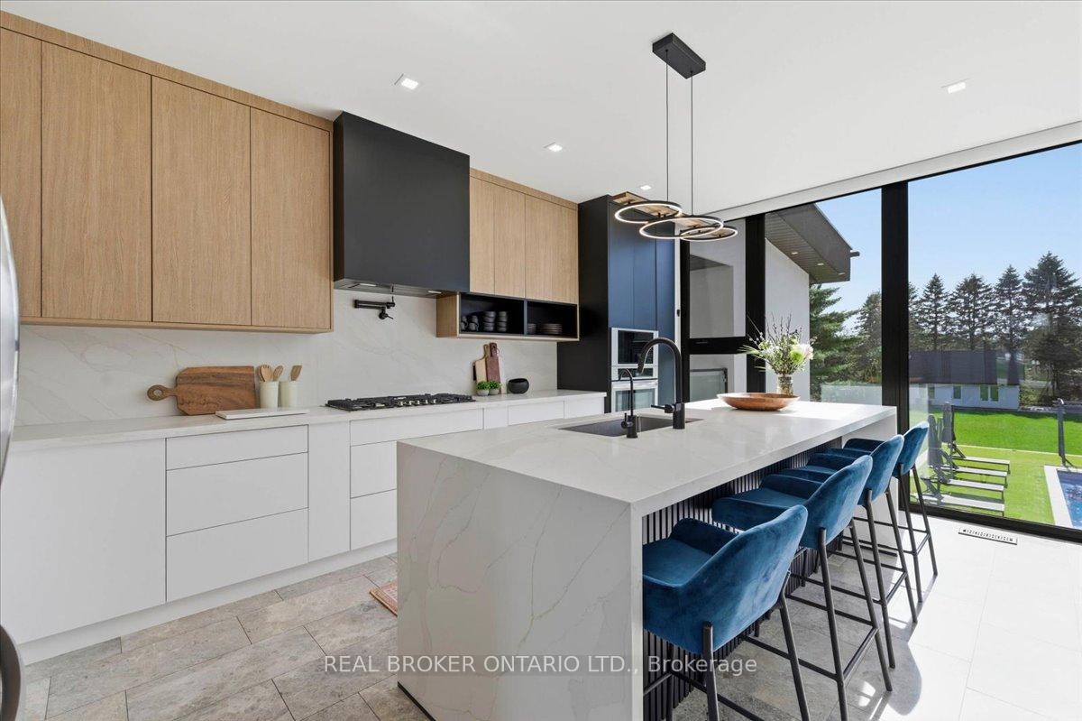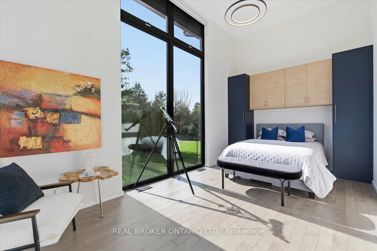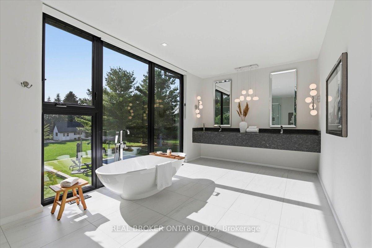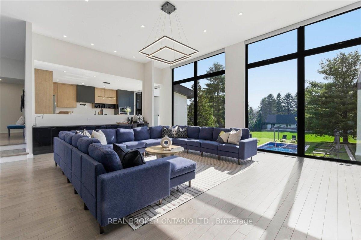 Modern architecture, set within a private acre setting. This custom-built bungalow in Mannheim brings together scale, light, and a seamless connection to the outdoors. Offering nearly 4,000 square feet above grade, the home is defined by clean lines, a full stucco exterior, and an understated yet intentional presence. Inside, 13 ft ceilings carry through the main living area, creating volume without excess. The family room anchors the home, where a statement fireplace set against a marble feature wall defines the space, while a full wall of glass frames uninterrupted views of the backyard. The outdoors becomes part of the everyday experience. The kitchen sits at the centre, refined and functional, with a waterfall-edge island and integrated finishes that support the space without overpowering it. With 5 bedrooms, 3 full bathrooms, and a dedicated office, the layout offers both separation and flexibility. The primary suite is set apart as a private retreat, positioned to take full advantage of the property. Elevated views extend over the backyard, with a private balcony that continues that connection outdoors, while the ensuite carries it further with a freestanding tub and glass shower. It's a space that feels quiet, intentional, and removed from the rest of the home. Additional space below offers 2,700 square feet ready to be shaped into wellness, recreation, or extended living. The backyard is where everything comes together. Set on a wide, tree-lined and fully fenced acre lot, the outdoor space is arranged around a saltwater pool with an automatic Coverstar safety cover, with multiple areas for dining, lounging, and gathering. A detached workshop, currently used as a golf simulator, and a separate storage shed add flexibility beyond the home. A two-car garage, equipped for electric vehicle charging, adds everyday convenience. Located just minutes from Kitchener-Waterloo, the setting offers privacy without compromise.