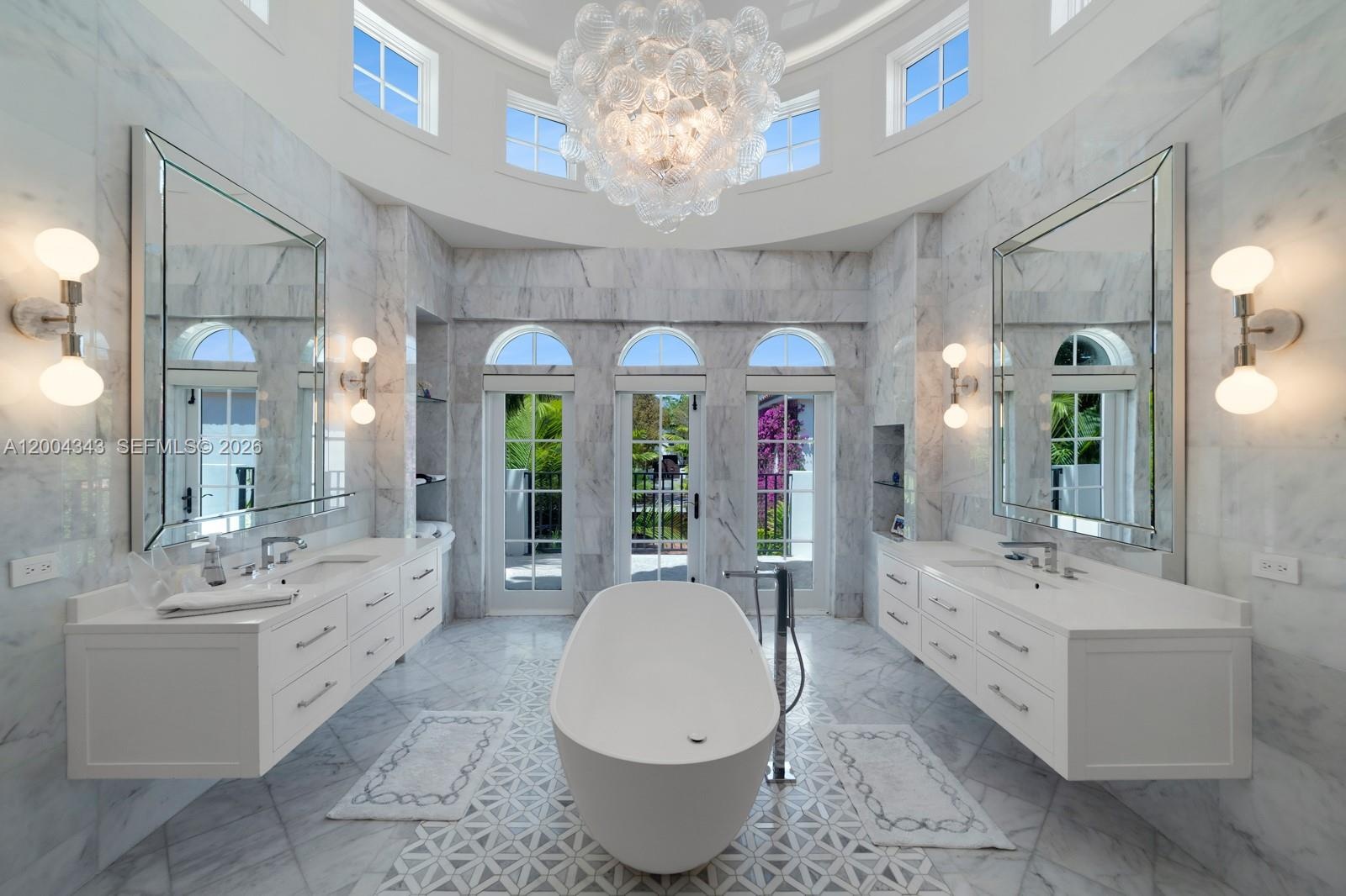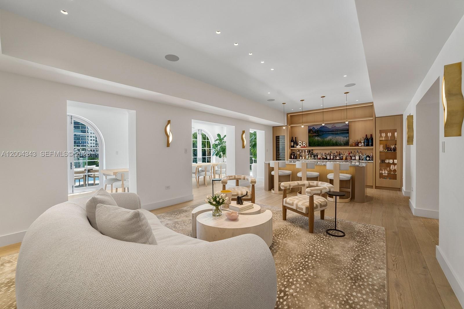 Behind a gated entrance on coveted Pine Tree Drive, this beautifully renovated waterfront retreat unfolds as a private sanctuary on a 12,920 SF lot with 76 feet of water frontage. Lush landscaping and understated elegance set the tone, while wide water views create a serene backdrop throughout. Light-filled, open living spaces with wide plank oak flooring flow seamlessly indoors to out, with expansive terraces & outdoor living areas. This home is made for effortless entertaining with a luxurious bar featuring natural stone and custom millwork. Unwind out by your sparkling pool & take in cool bay breezes. This 5-bedroom, 5.5-bath home offers comfort and refinement, featuring 4 bedrooms in the main residence and a separate guest house with an additional bedroom for visitors. Upstairs, the oversized principal suite is a tranquil oasis with a striking marble bath and double height ceilings. Enjoy living in this tropical haven in the heart of Miami Beach.