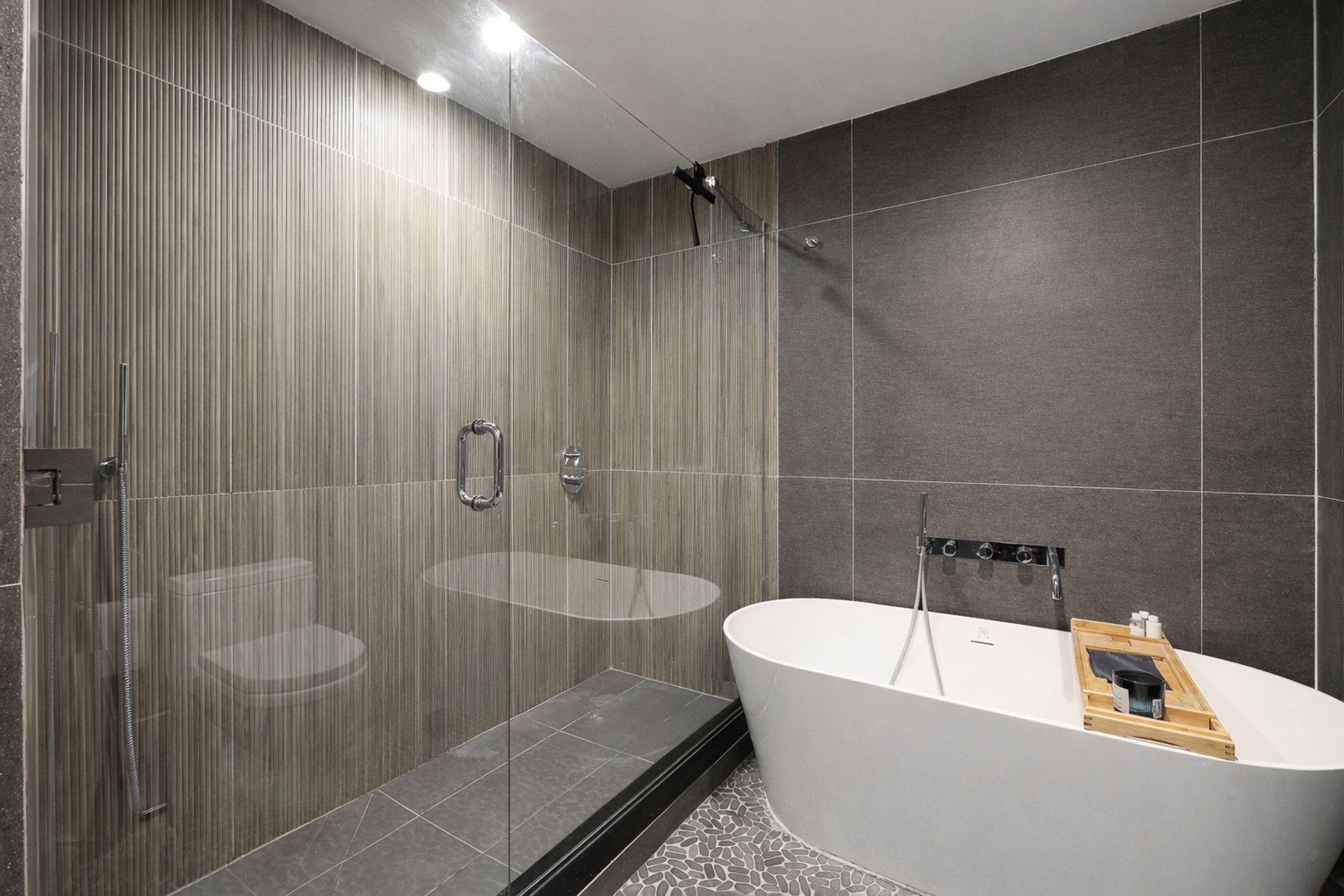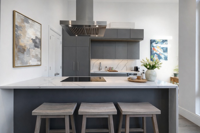 The generously sized primary suite easily accommodates a king-size bed and includes a walk-in closet and a private en suite bath. On the top level, you'll find two queen-size bedrooms, a second bathroom, a work area, and in-unit laundry. Both bathrooms are finished with Italian tile and feature Duravit and Moen fixtures.
