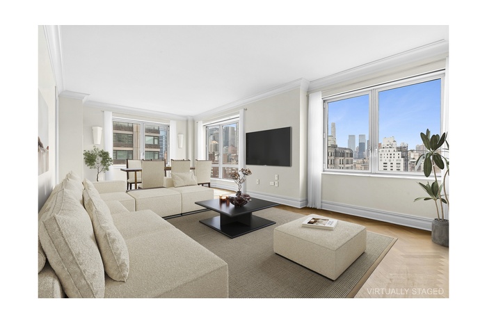 Welcome to The Chatham, a Robert A.M. Stern-designed luxury condominium on the Upper East Side, where timeless elegance meets modern comfort. This move-in-ready corner residence boasts approximately 1,441 sq ft of thoughtfully designed space. A gracious entry gallery leads to a sunlit living and dining area, framed by oversized bay windows with south and west exposures, offering breathtaking sunset.