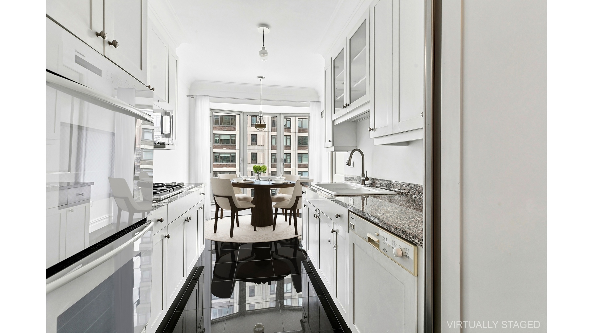 The windowed eat-in kitchen is a chef's dream, featuring a SubZero refrigerator, five-burner Thermador cooktop, double-wall oven, dual sinks with disposal, and Miele dishwasher, all complemented by granite countertops. The oversized primary bedroom offers three generous closets and a large marble en-suite bath. The second bedroom is equally spacious, and the apartment features 2.5 marble baths, central air, custom crown moldings, ample closet space, and in-unit washer/dryer.