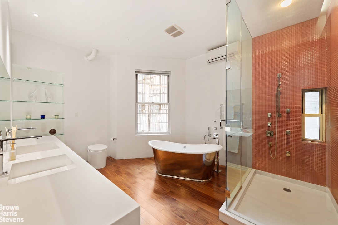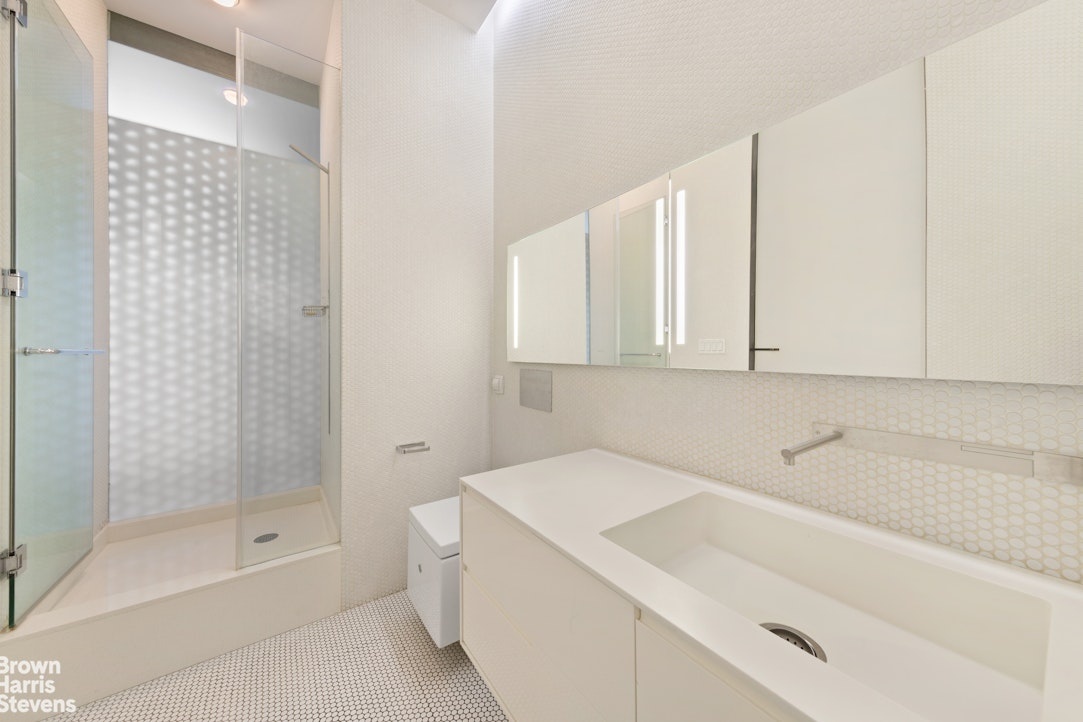 As you enter the spa-like bath you will find a sculptural deep soaking tub and a very sizeable tall walk-in glass enclosed shower with multiple sprayers for relaxation. The long vanity has double sinks and excellent storage.