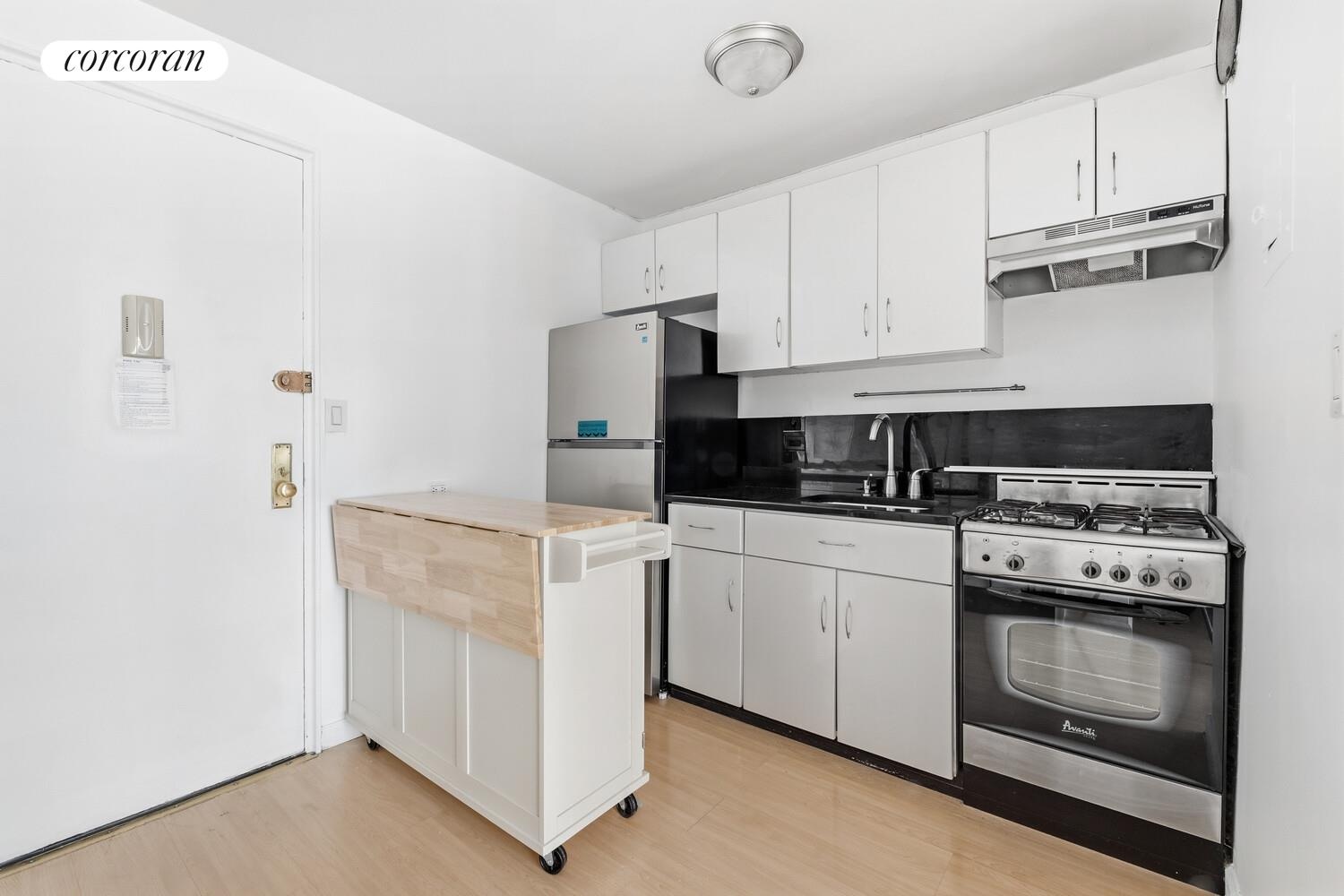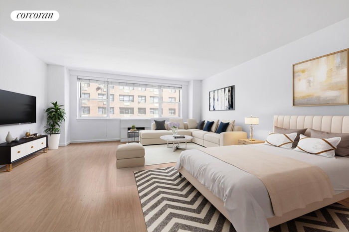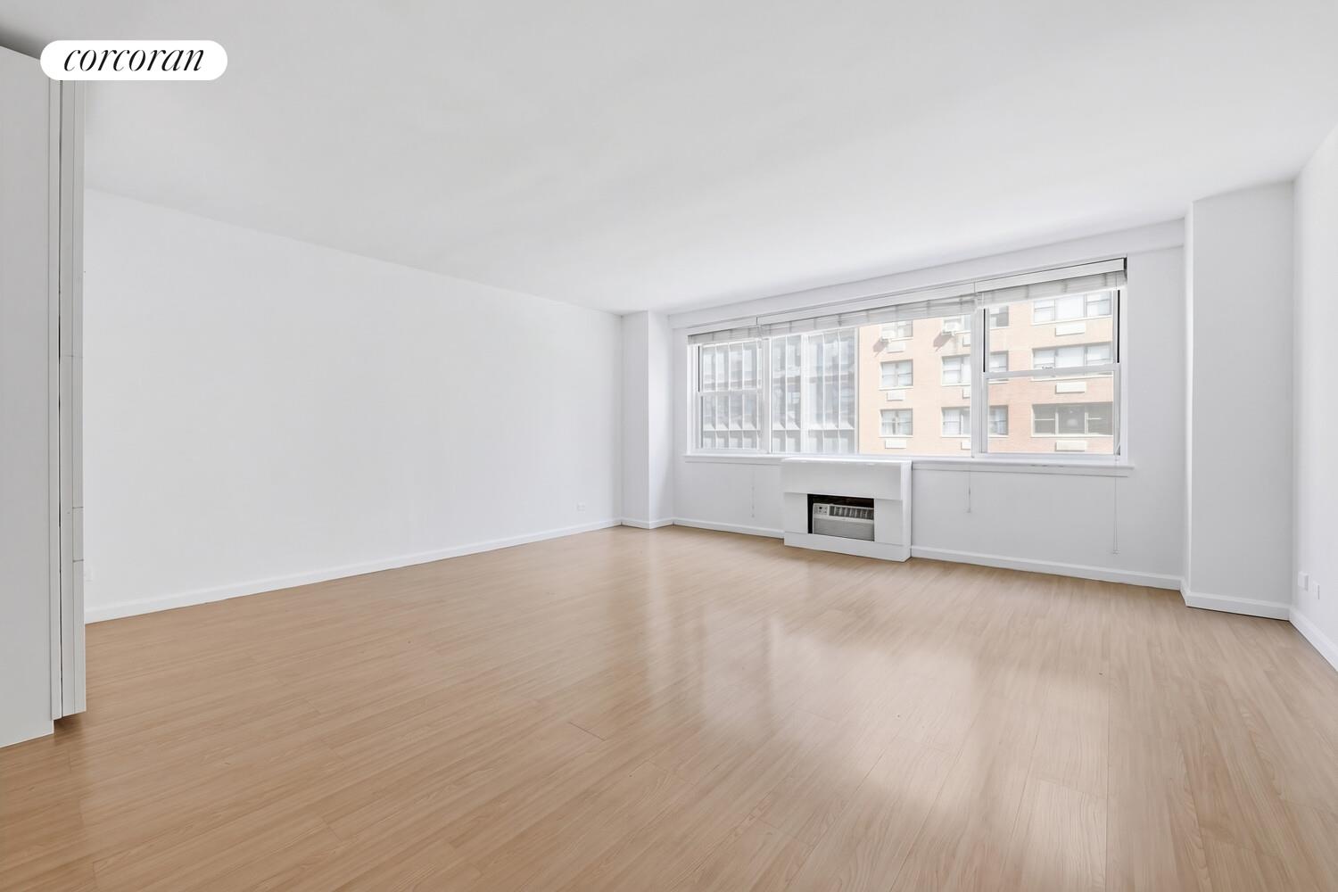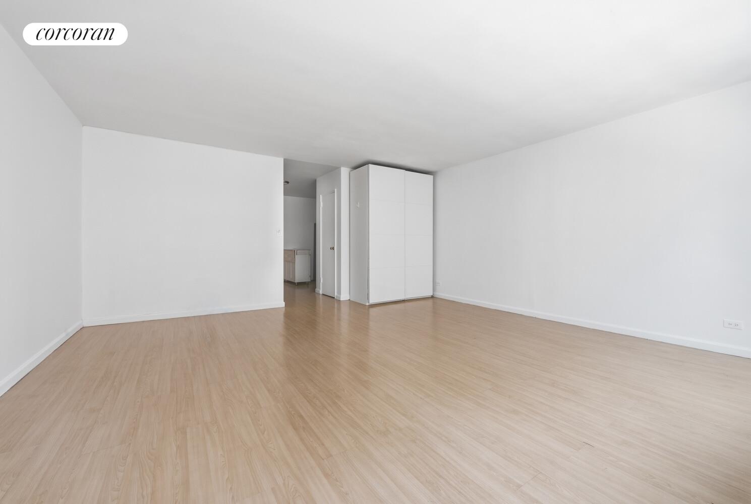 The unit features an updated kitchen with sleek stainless steel stainless appliances, along with recently renovated flooring and bathrooms. A generous closet space setup and a separate dressing area add flexibility and functionality to the studio layout.