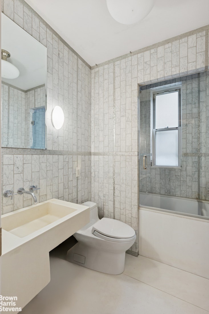 An inviting, generously proportioned foyer with abundant closets opens into a grand living and dining room. This striking space is anchored by a working fireplace, soaring 9'5" ceilings, and four oversized windows overlooking a tranquil row of charming townhouses and leafy treetops. With exposures to the north and south, the home is filled with natural light throughout.