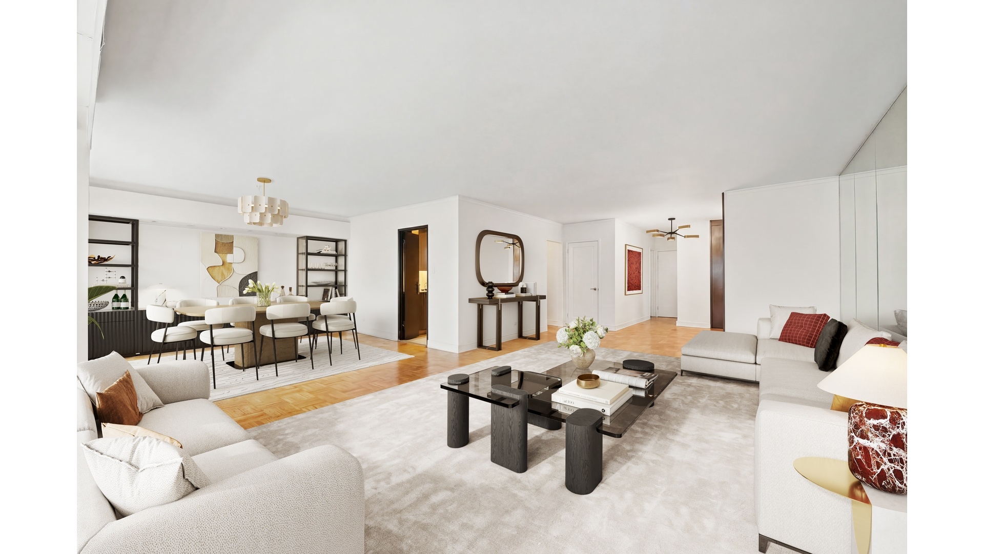 Every room is generously proportioned. The oversized living room accommodates both a full seating area and a large dining setup, ideal for entertaining. Both bedrooms are substantial in size, each fitting a king bed with additional space for furnishings. Storage is exceptional, including a large walk-in closet in the primary suite.