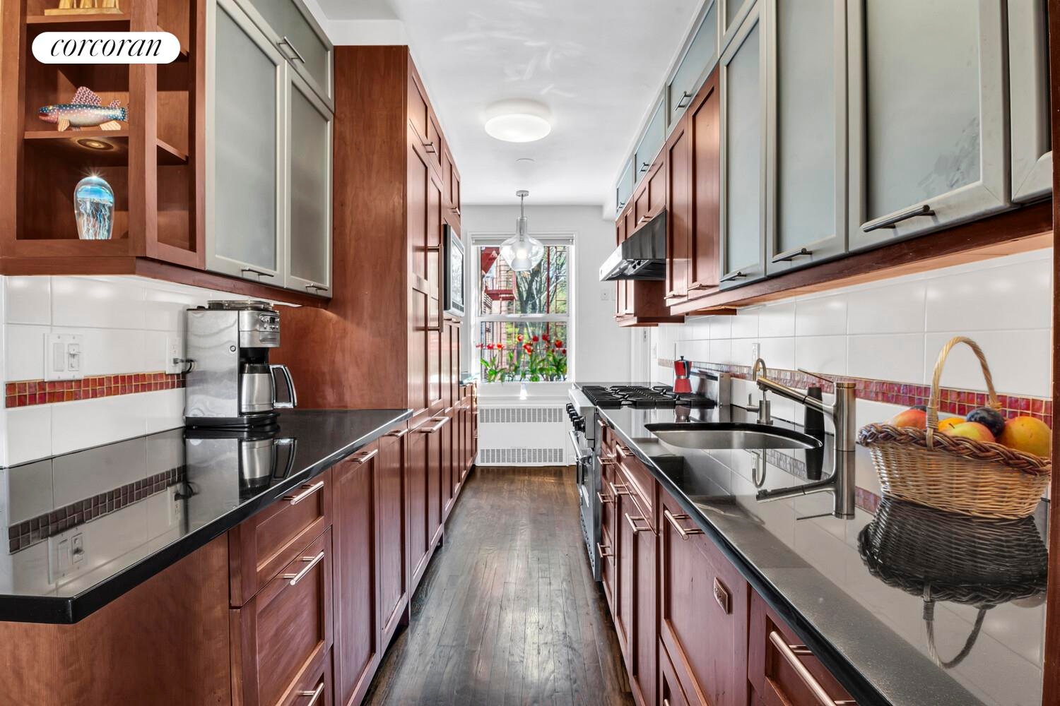 A gracious entry foyer leads into a sun-filled living and dining area, where walnut-stained hardwood floors run throughout and oversized windows overlook the tree-lined streets of the neighborhood. The windowed chef's kitchen is both functional and well-appointed, featuring a six-burner Viking range with vented hood, paneled Thermador refrigerator, built-in microwave, and Fisher & Paykel double-drawer dishwasher. Shaker-style cabinetry, granite countertops, a deep sink, wraparound breakfast bar, and pantry provide excellent storage and workspace.