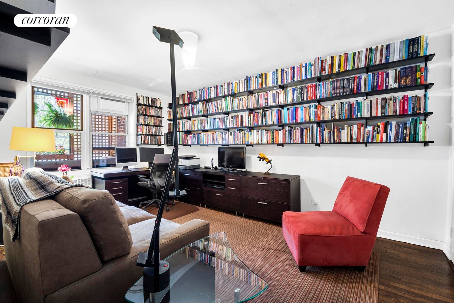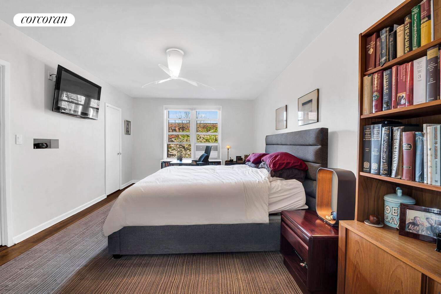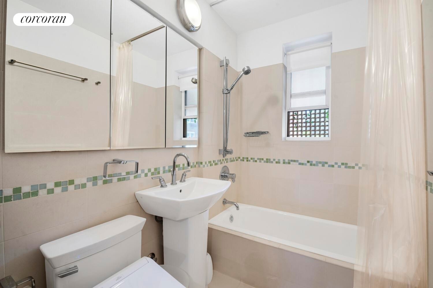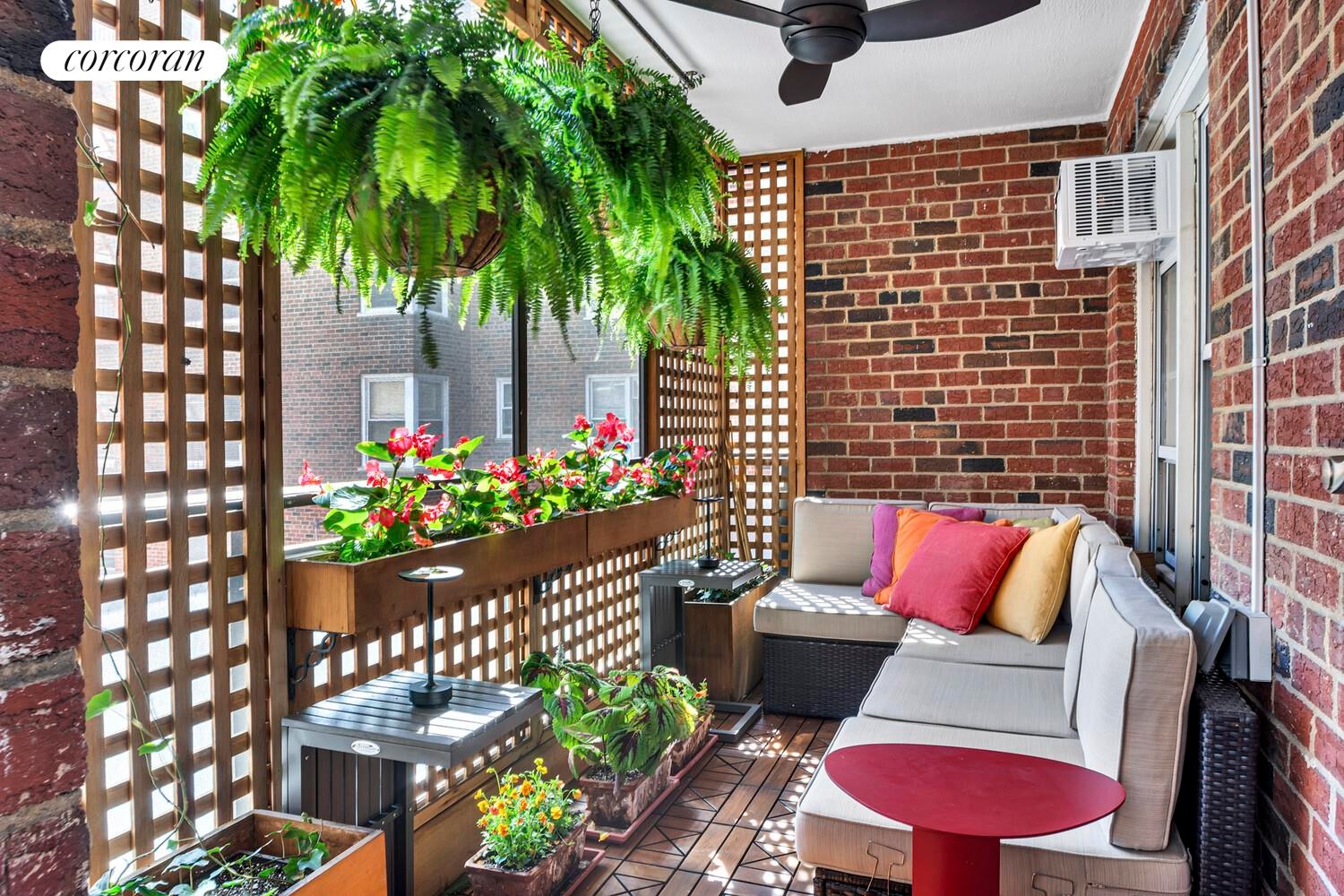 Just off the kitchen, a covered private terrace with lush landscaping and custom latticework offers a peaceful outdoor retreat rarely found in Jackson Heights. The primary bedroom easily accommodates a king-sized layout and includes a walk-in closet and a windowed en-suite bath with classic tilework and glass-enclosed shower. The second bedroom, currently configured as a home office, is generously sized and enjoys direct terrace views. A second full windowed bathroom with tub completes the home, along with extra linen and utility closets.