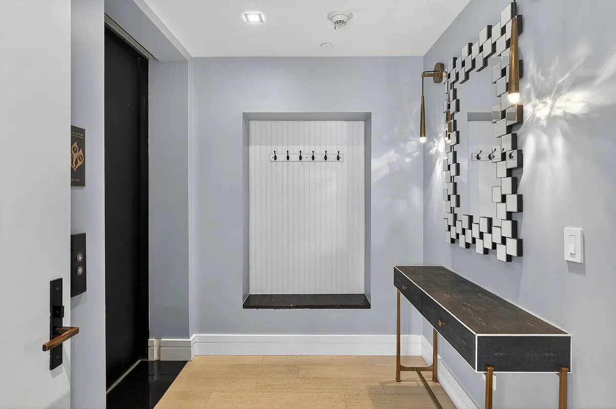 A keyed elevator opens directly into a private entry foyer with integrated storage. Beyond, the great room stretches wide with eastern exposure and a wall of oversized windows that bring in steady, natural light. A telescopic glass wall allows the kitchen to be closed off when desired, while maintaining visual continuity.