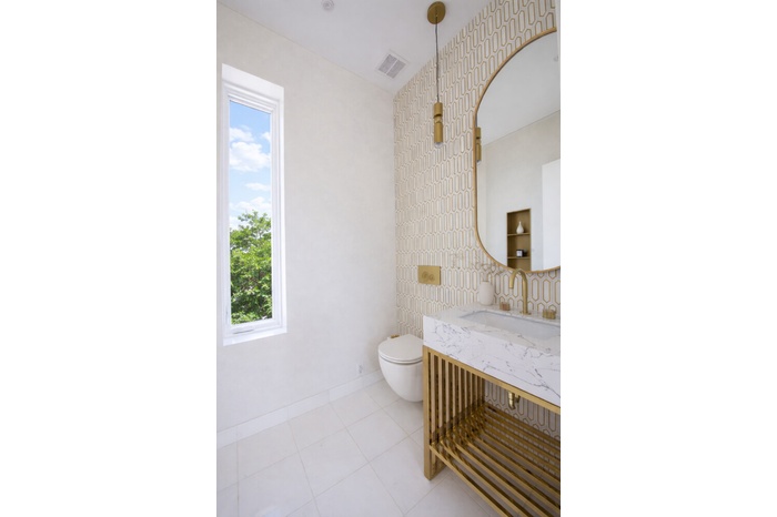 On the main level, a sun-filled open living and dining area extends to a southeast-facing terrace that spans the length of the home, creating a bright and inviting setting for everyday living and entertaining. The chef's kitchen is thoughtfully designed with clean finishes and a high-end appliance package, including a Bertazzoni induction range, double oven, French-door refrigerator, and quartz slab waterfall countertops. White oak herringbone flooring throughout the residence adds warmth and continuity.