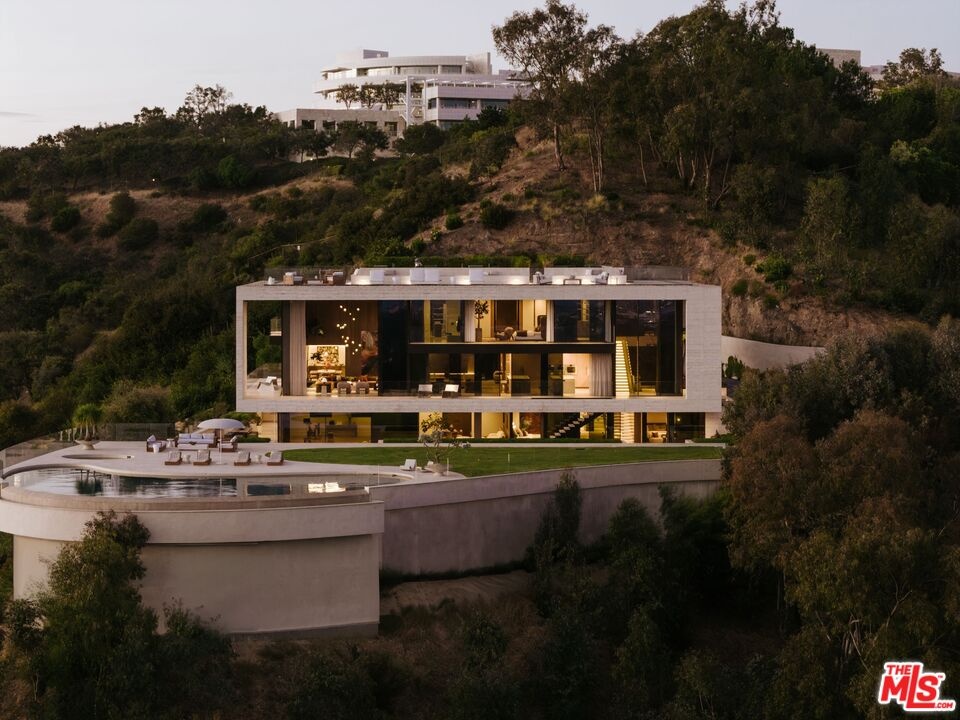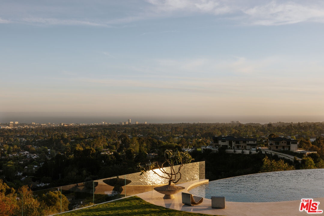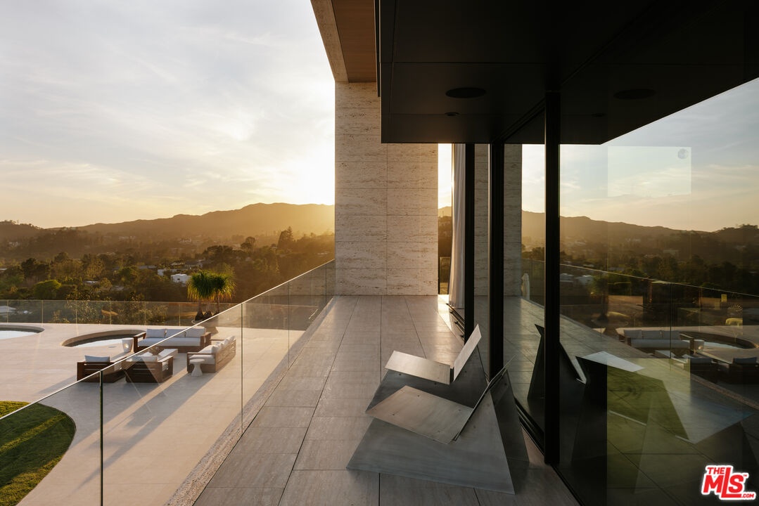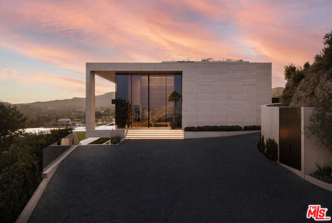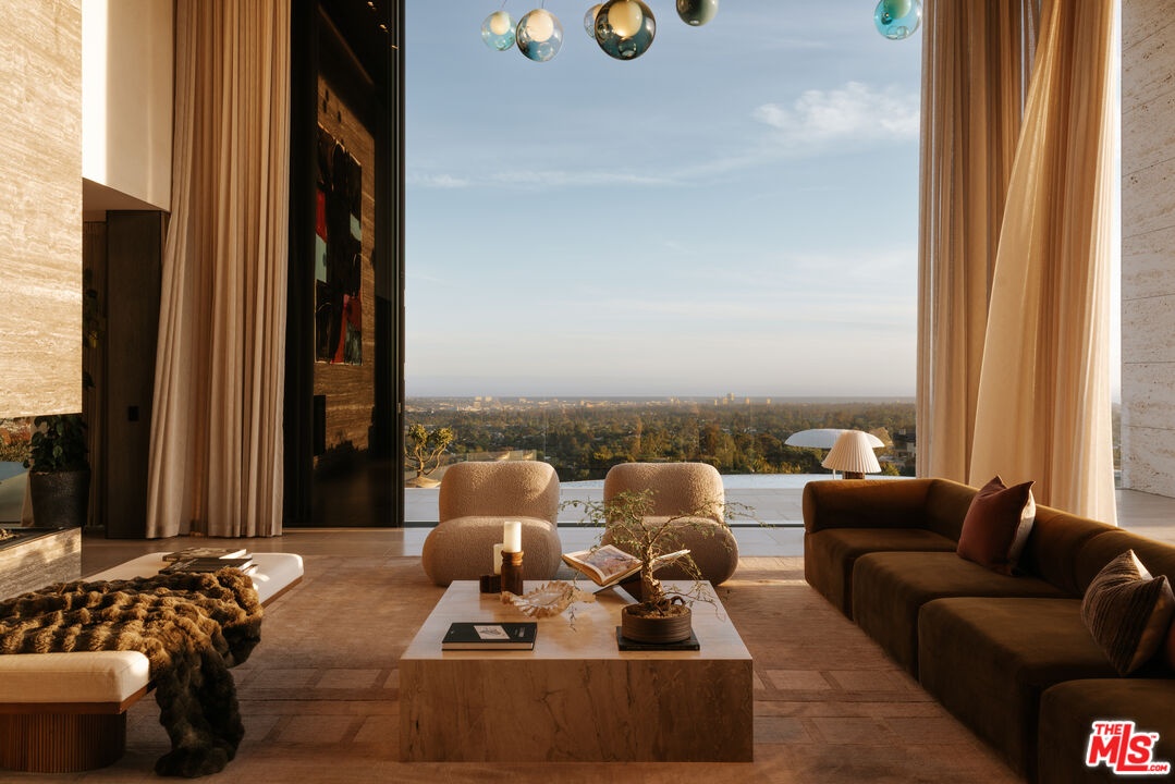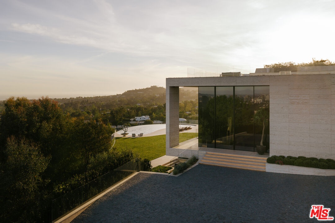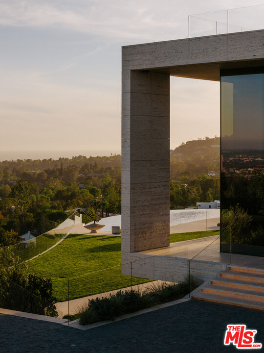 Sempre Vista. Representing one of the most compelling offerings in Los Angeles' luxury market in years. With over 12,500 square feet of Thomas Juul-Hansen architecture on 2 private acres in prime Brentwood. Juul-Hansen, the Danish architect, designed Sempre Vista as a monumental rectangular frame clad in sandblasted Alabastrino travertine, a finish chosen for its depth, warmth, and the way it holds light across the face of the building. Executed by Roderick Builders with the precision the design demanded, nearly 19-foot seamless motorized glass panels dissolve every wall, and the columns recede so completely at the lower level that the entire structure appears to float above the hillside. The views run coast to canyon, ocean to skyline, without a single interruption. Six bedroom suites, ten baths, elevator, double-height formal living room and foyer, Gaggenau kitchen with two oversized islands and custom oak cabinetry with recessed brass hardware, glass-enclosed temperature-controlled wine cellar, three-tier theater, massage room, sauna with a dedicated view window, gym, Gessi fixtures throughout, Cohiba granite primary bath with a cold plunge, steam shower, and in-shower TV, Calacatta Lincoln marble secondary bath, four-car garage, infinity pool curving with the natural contour of the hillside, and, at the crown, a 2,500+ square foot rooftop terrace with floating travertine decking and seamless glass railings where the Pacific, the mountains, and the entire Los Angeles basin unfold simultaneously. Situated on one of Brentwood's most coveted and private hillside addresses, less than five minutes from Sunset Boulevard, with views that reach from the ocean to downtown that few properties in this city achieve.