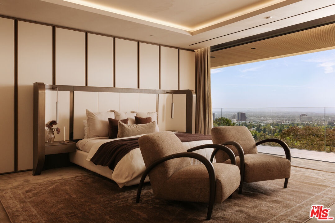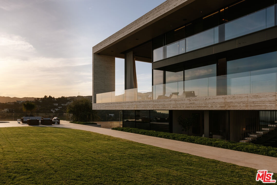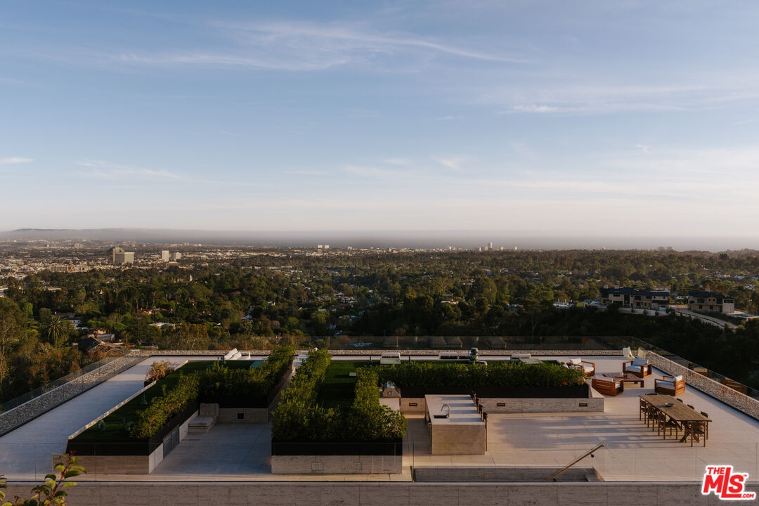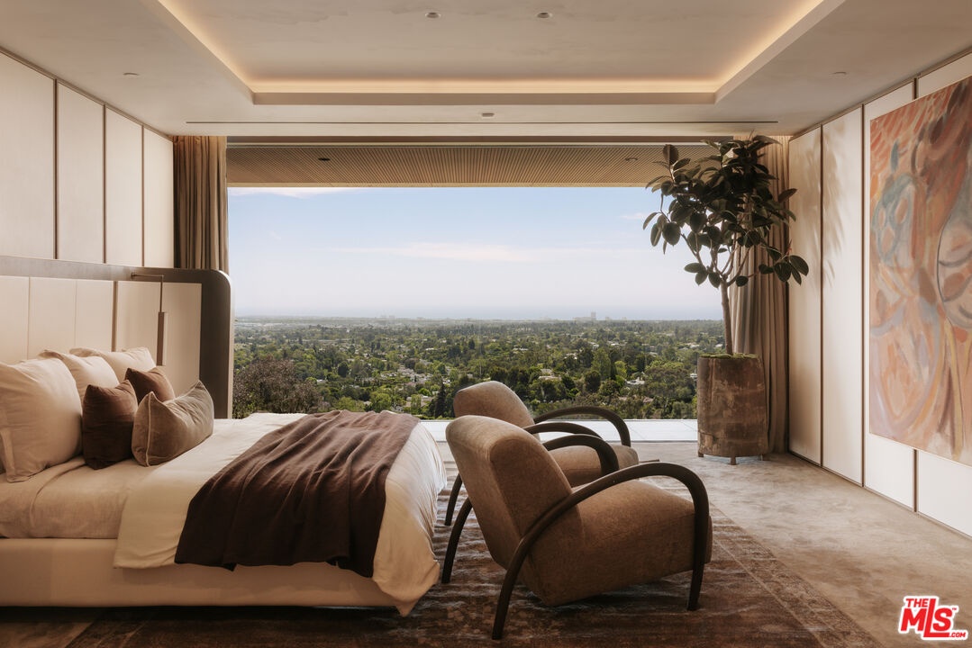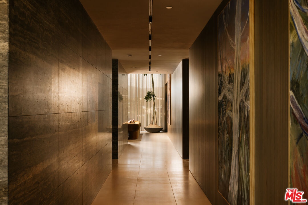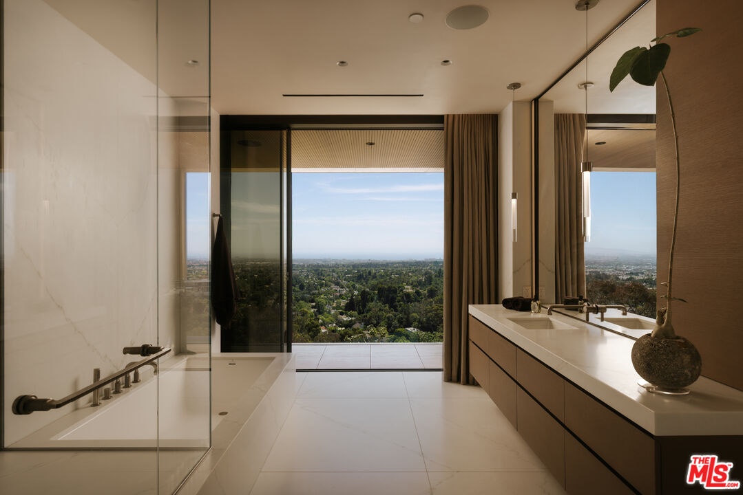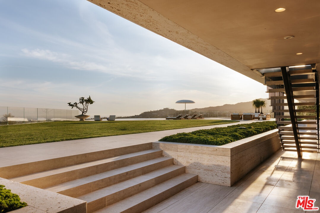 Sempre Vista. Representing one of the most compelling offerings in Los Angeles' luxury market in years. With over 12,500 square feet of Thomas Juul-Hansen architecture on 2 private acres in prime Brentwood. Juul-Hansen, the Danish architect, designed Sempre Vista as a monumental rectangular frame clad in sandblasted Alabastrino travertine, a finish chosen for its depth, warmth, and the way it holds light across the face of the building. Executed by Roderick Builders with the precision the design demanded, nearly 19-foot seamless motorized glass panels dissolve every wall, and the columns recede so completely at the lower level that the entire structure appears to float above the hillside. The views run coast to canyon, ocean to skyline, without a single interruption. Six bedroom suites, ten baths, elevator, double-height formal living room and foyer, Gaggenau kitchen with two oversized islands and custom oak cabinetry with recessed brass hardware, glass-enclosed temperature-controlled wine cellar, three-tier theater, massage room, sauna with a dedicated view window, gym, Gessi fixtures throughout, Cohiba granite primary bath with a cold plunge, steam shower, and in-shower TV, Calacatta Lincoln marble secondary bath, four-car garage, infinity pool curving with the natural contour of the hillside, and, at the crown, a 2,500+ square foot rooftop terrace with floating travertine decking and seamless glass railings where the Pacific, the mountains, and the entire Los Angeles basin unfold simultaneously. Situated on one of Brentwood's most coveted and private hillside addresses, less than five minutes from Sunset Boulevard, with views that reach from the ocean to downtown that few properties in this city achieve.